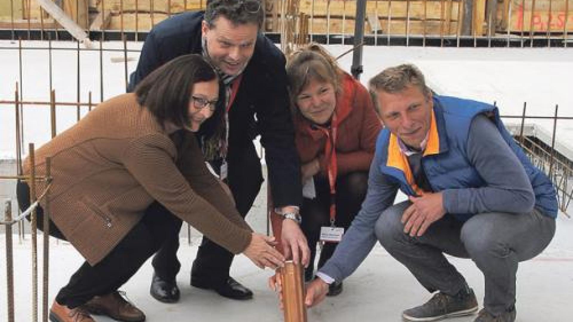 Als symbolischen Startschuss – die Bauarbeiten haben inzwischen schon begonnen – versenkten Tobias Strieder (Vorstand Caritasverband Leipzig), Maria Baumann (Assistentin des Vorstandes), Annett Trenz und Jörg Wimmer (Geschäftsführung des Bauträgers basis|d) in der Bodenplatte eine Kapsel mit wichtigen Dokumenten zum Bauvorhaben sowie aktuellen Zeitzeugnissen.