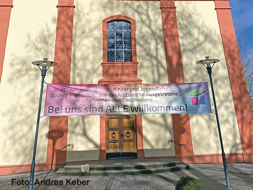 St. Franziskus entschied, es der Leipziger Propstei-Gemeinde nachzutun. Diese hatte Plakate aufgehängt mit einem Angebot an Ausgetretene, weiter am kirchlichen Leben teilzunehmen. Im Pfarrbrief von St. Franziskus heißt es, die Gemeinde will „alle(!) Ausgetretenen, die es möchten, weiterhin einladen, am Gemeindeleben teilzunehmen, auch an Gottesdiensten und am Sakramentenempfang“. Seit kurzem nun hängt ein entsprechendes Banner vor St. Franziskus.