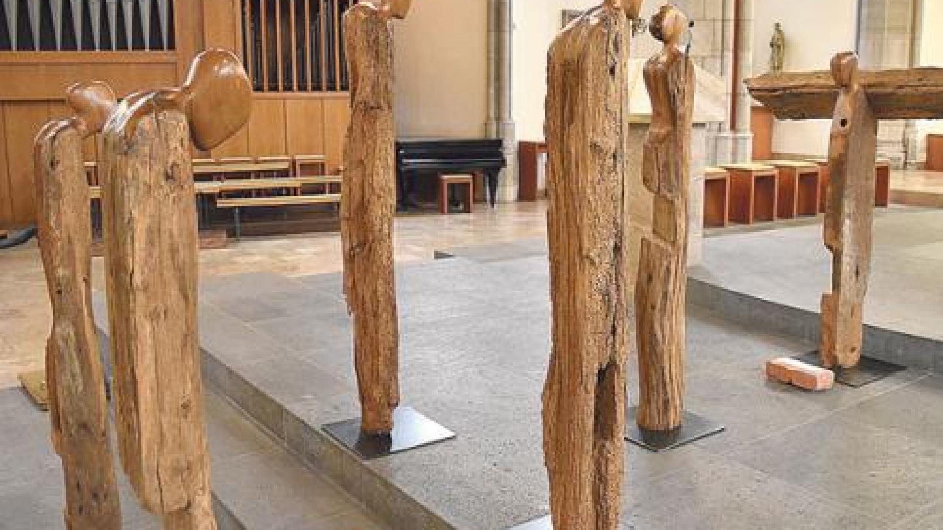 In einer Zeit, in der auf unnötige Kontakte verzichtet werden sollte, sind direkte Begegnungen mit starren und etwas fragwürdigen Gästen in der katholischen Pfarrkirche „St. Josef“ in der Waidstraße in Mühlhausen jedoch ausdrücklich erwünscht. Denn in deren lichtdurchflutetem großen Altarraum lenken seit Aschermittwoch sechs seltsame wirkende und vom Zahn der Zeit gezeichnete Eichenbalken die Blicke der Gläubigen und anderer Besucher auf sich.