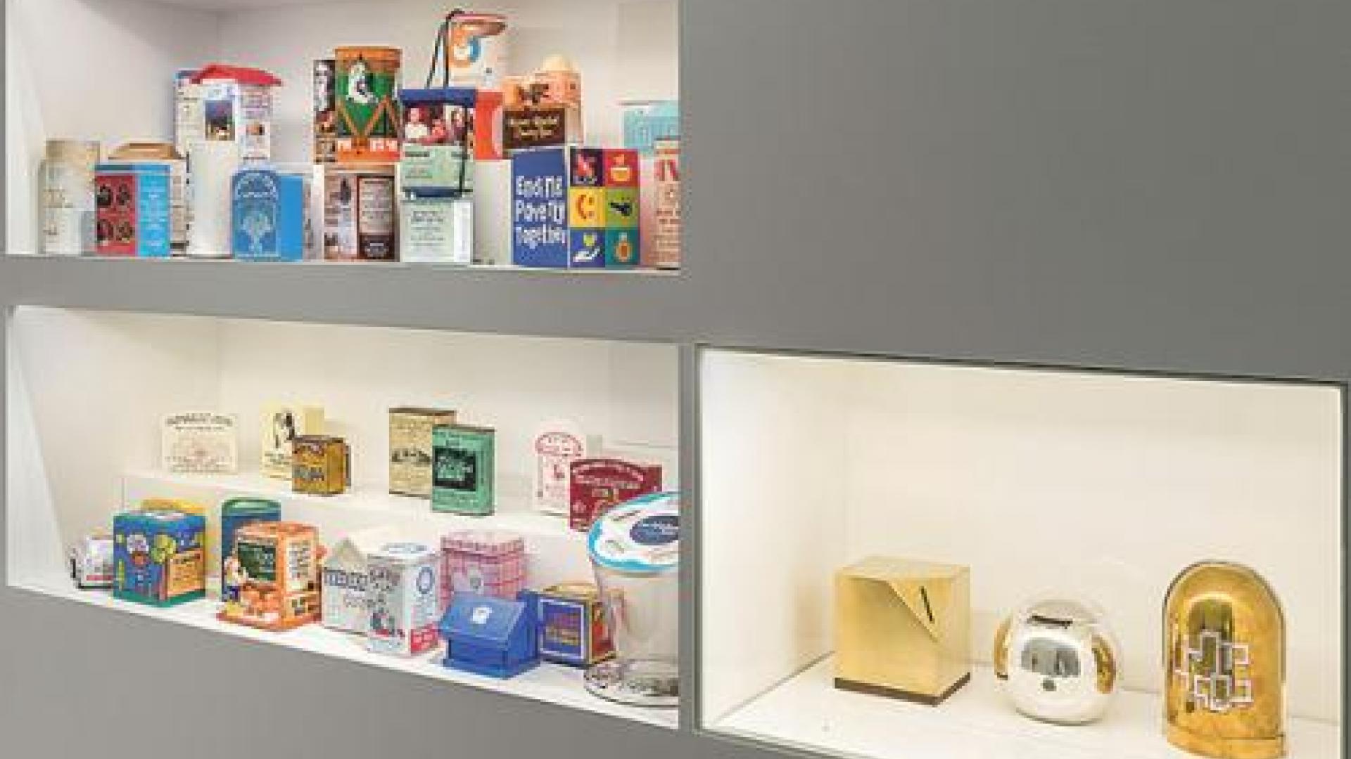 | Sammlung von Zedaka-Büchsen (Wohltätigkeitsbüchsen). Foto: Jüdisches Museum Berlin/Roman März |