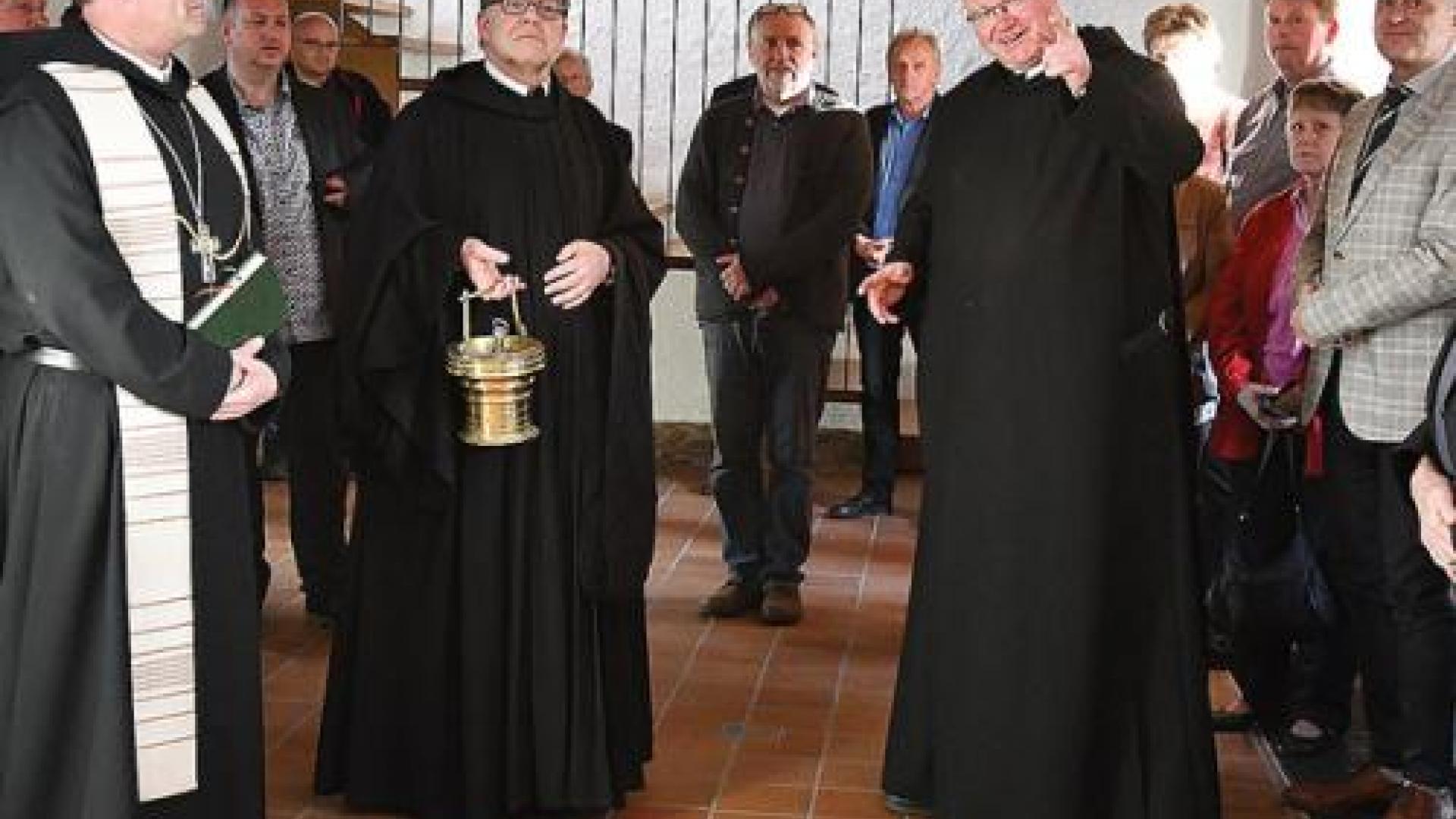 | Pater Maurus Kraß gibt beim Rundgang durch die restaurierten Räume des Torhauses Erläuterungen. Links im Bild ist Abt Barnabas Bögle zu sehen, der die Räume segnet. | Foto: Elisabeth Meuser |