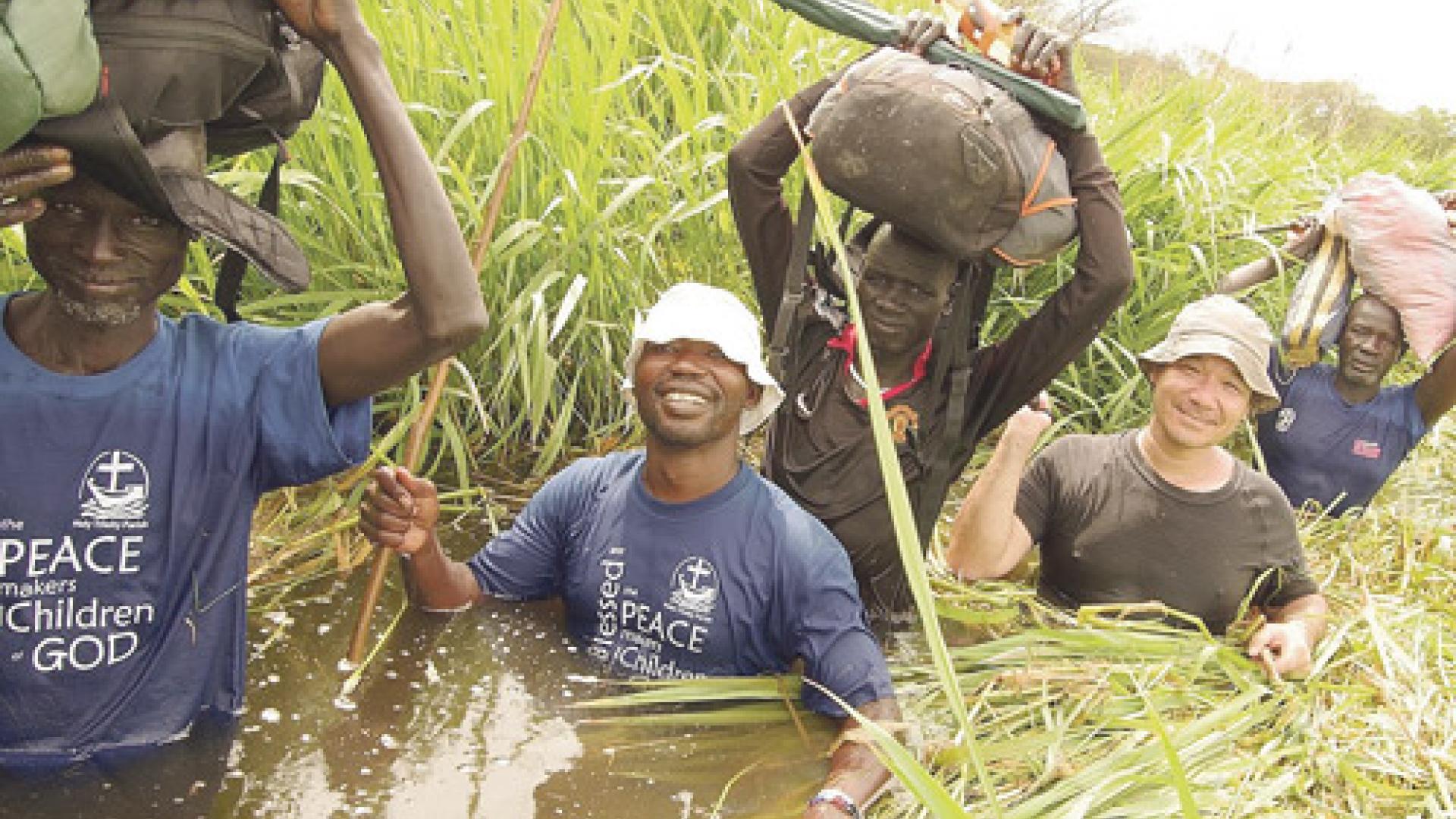 | Pater Gregor Schmidt (Zweiter von rechts) mit seinem Mitbruder Pater Alfred (Zweiter von links) und drei Katecheten auf Kapellenwanderung im Sumpfland des Nil. | Fotos: Privat |