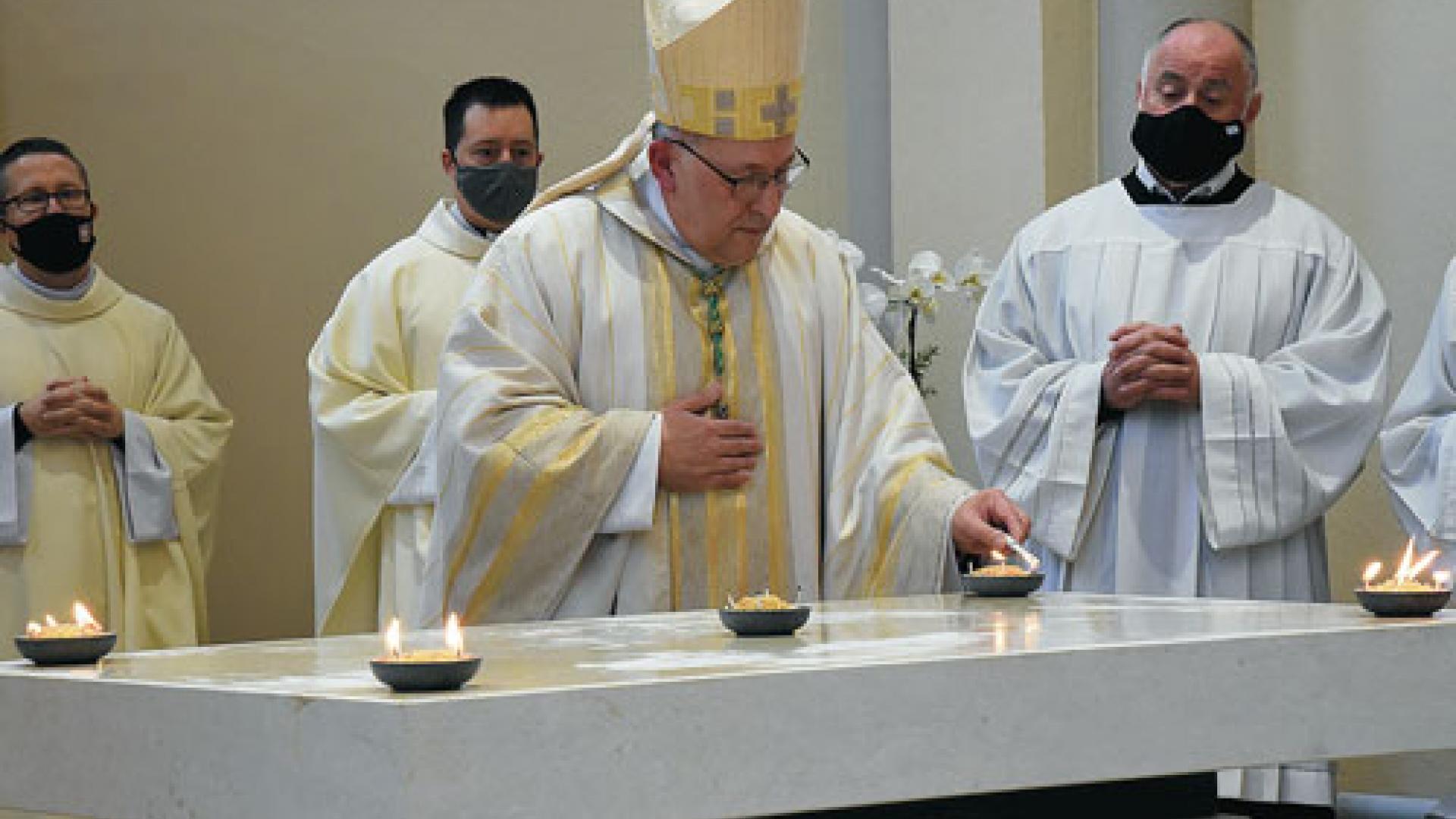 Ein Küster stellt fünf Gefäße auf die Kreuze, welche im Altar auf die Wundmale Christi hinweisen. Er befüllt die Schalen mit Weihrauch. Von der Osterkerze wird das Licht geholt, das die Dochte in den fünf Weihrauchschalen entfachen. „Komm, Schöpfer Geist, kehr bei uns ein, besuch das Herz der Kinder dein: Die deine Macht erschaffen hat, erfülle nun mit deiner Gnad...“ Nach dem Weihegebet werden die Weihrauchschalen vom Altar genommen und der Altar mit Papiertüchern trocken gewischt. Zunächst wird ein Wachstuch auf den Altar gelegt, darauf das Altartuch. Das Licht von der Osterkerze, von Christus her, wird zum Bischof gebracht, der es nach den Worten „Christi Licht leuchte auf dem Altar, es strahle wider im Leben aller, die teilhaben am Tisch des Herrn“ an Pfarrer Laske weitergibt. Anschließend wird die erste heilige Wandlung auf dem neuen Tisch des Herrn vollzogen.