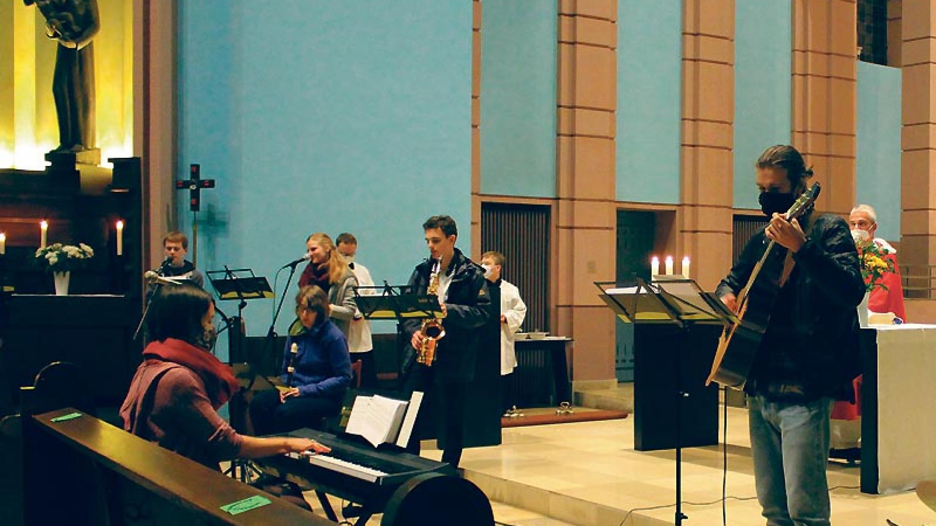 Alles auf Abstand, auch die Band am Altar: Der Semester-Eröffnungsgottesdienst der KSG Berlin am 8. November.- Foto: KSG Berlin |