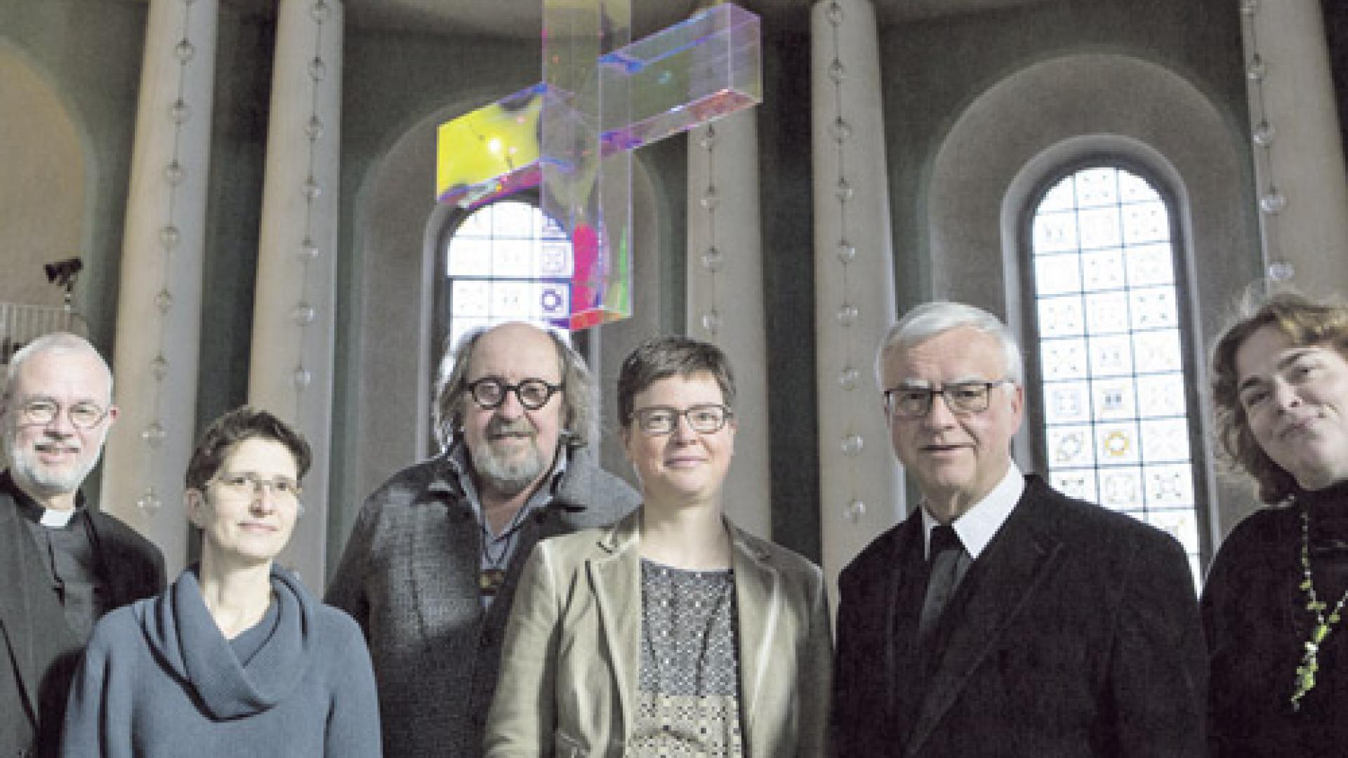 | Projektinitiatorinnen, Geistliche und Künstler freuen sich über das Lichtkreuz: Dompropst Tobias Przytarski, Bettina Birkner, Ludger Hinse, Carla Böhnstedt, Erzbischof Heiner Koch, Roswitha Sauer. | Fotos: Walter Wetzler |