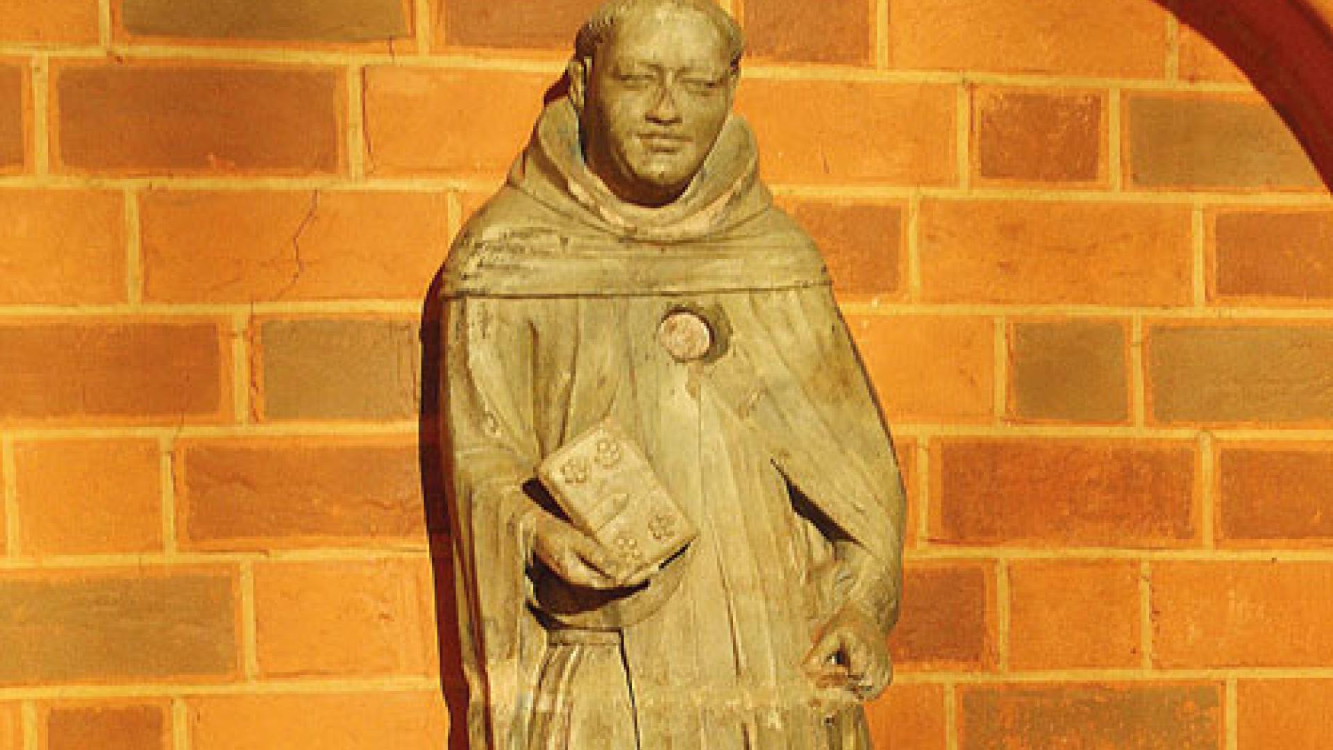| Graf Wichmann von Arnstein war Prämonstratenser-Mönch und Propst des Magdeburger Domstifts. 1224 lernte er Dominikaner kennen, die ihn so stark beeindruckten, dass er Amt und Würden aufgab und sich ihnen anschloss. 1246 wurde er Prior des neugegründeten Dominikanerklosters Neuruppin, wo er 1270 im Rufe der Heiligkeit starb. Nach ihm wurde das am 22. Oktober 1977 eingeweihte kleine katholische Gemeindezentrum in Rheinsberg benannt. Eine Skulptur in der ehemaligen Klosterkirche St. Trinitatis in Neuruppin (Foto: wikimedia) erinnert an ihn. |