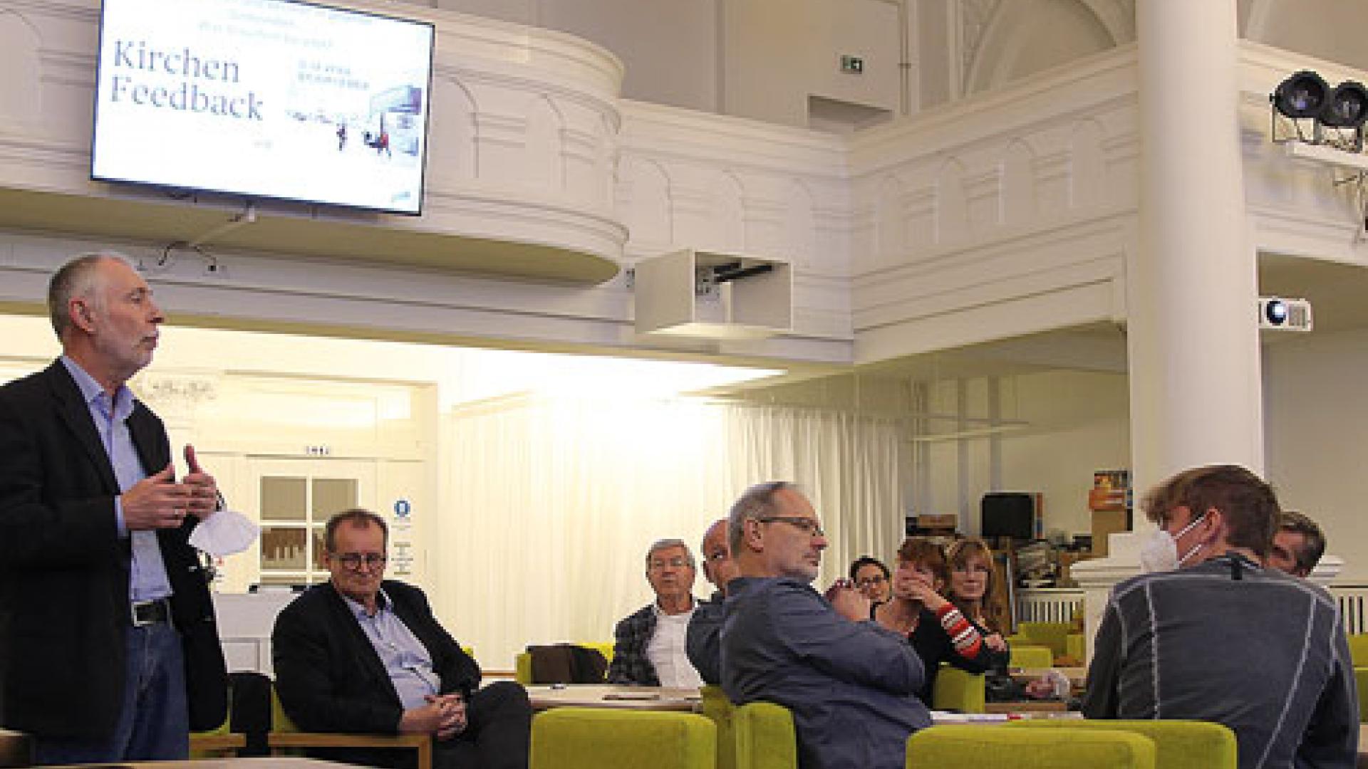 Die Ergebnisse der Umfrage, an der 305 Teilnehmer aus über 90 Berliner Gemeinden verschiedenster Konfessionen teilgenommen haben, stellte Andrea Meyerhoff im Wechsel mit Heiko Kienbaum vor. Kienbaum ist im Vorstand des Vereins „Institut für Kirche 4.0“, dessen Initiative „kirchenfeedback.de“ es sich auf die Fahnen geschrieben hat, durch regelmäßiges und konstruktives Feedback dazu beizutragen, „dass in Kirchen und Gemeinden weise und fundierte Entscheidungen getroffen werden“. Kienbaum stellt klar, dass die Umfrage nach wissenschaftlichen Kriterien ausgewertet wurde, sodass deren Ergebnisse so repräsentativ wie möglich seien.
