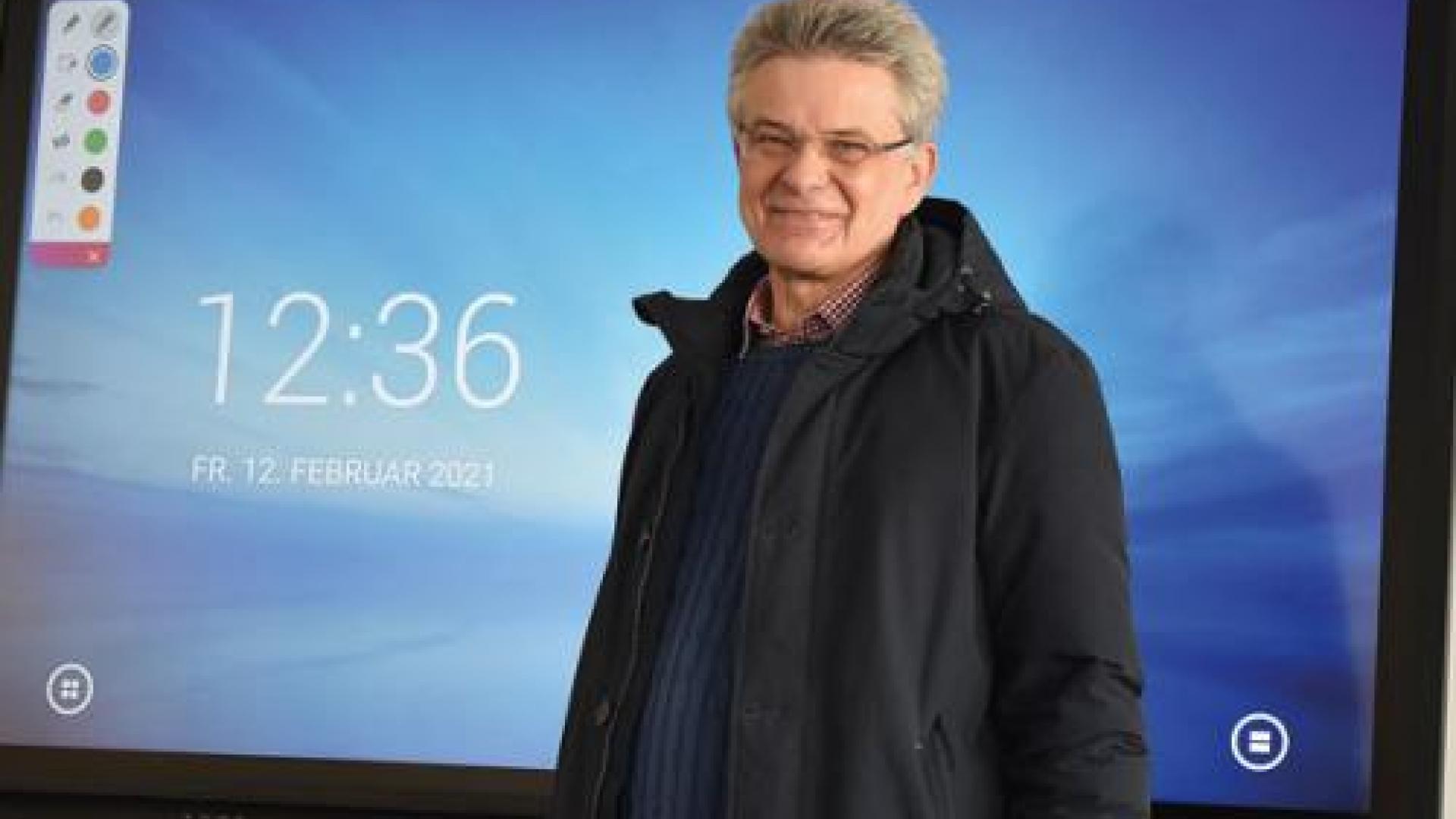 | Moderne Kommunikationstechnik einzusetzen, war Johannes Weischede als Lehrer und Schulleiter wichtig. Hier ist er vor einer digitalen Tafel zu sehen, die zu den neuesten Errungenschaften der Marienschule gehört. Fotos: Dorothee Wanzek |