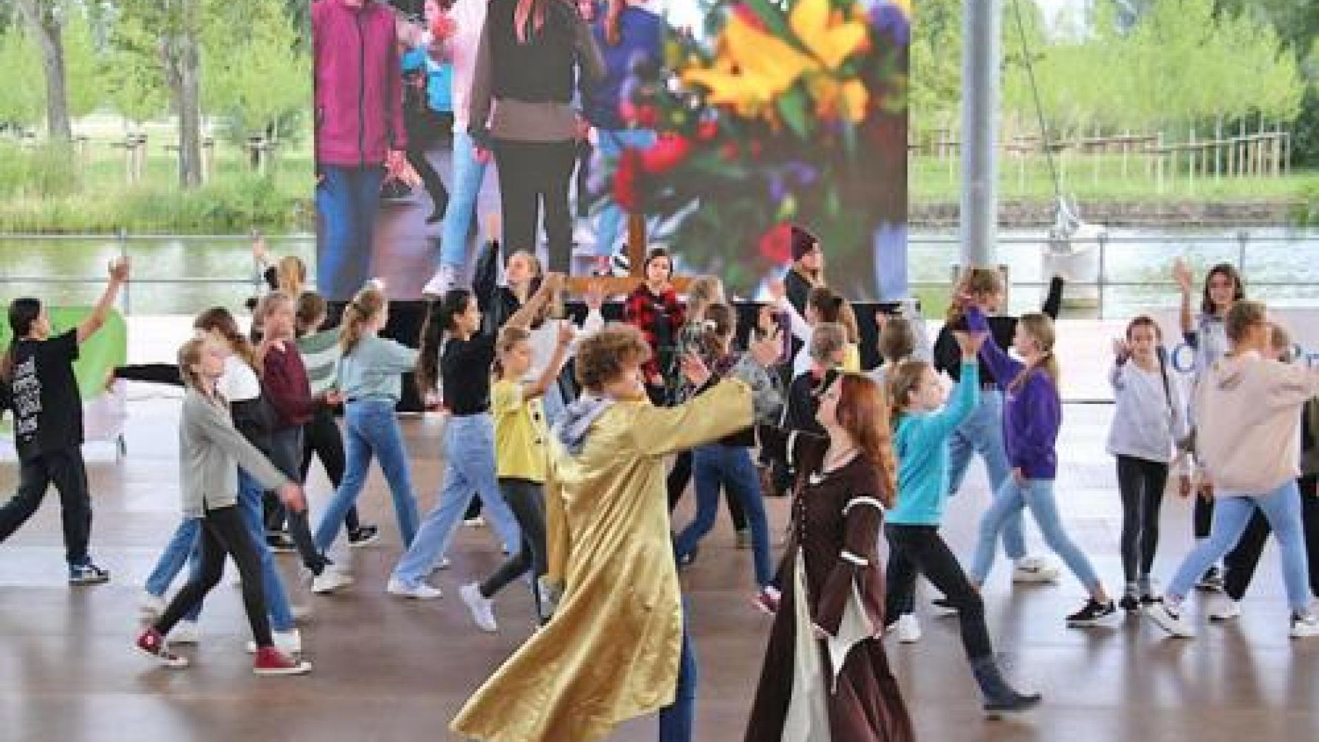 | Mit diesem Tanz gelangt Norbert im Stück „Norbert for Future“ vom Damals ins Hier und Heute. Schüler führten das Stück anlässlich des 30-jährigen Bestehens ihres Norbertusgymnasiums und zum 900. Gründungsjubiläum der Prämonstratenser auf der Seebühne im Elbauenpark in Magdeburg auf. Foto: Susanne Sperling |