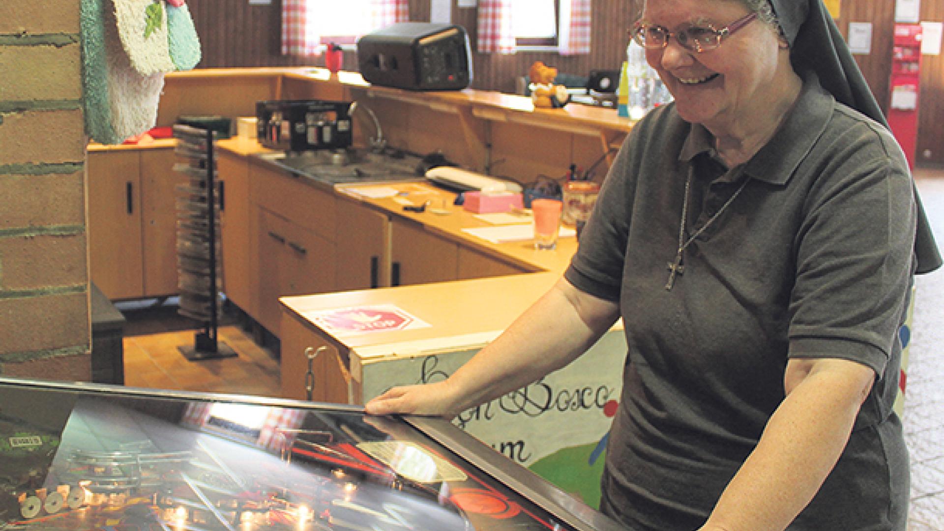 | Schwester Lydia Kaps an ihrem Lieblingsgerät, dem Flipperautomaten im Don-Bosco-Jugendzentrum. Fotos: Oliver Gierens |