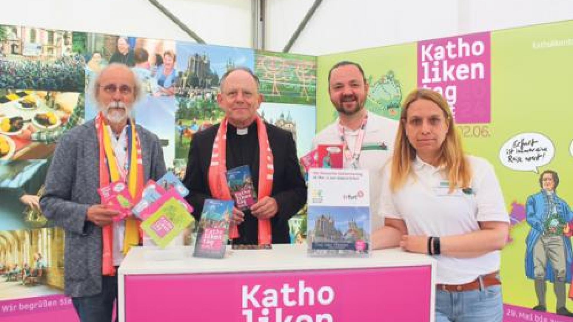 | Auf dem Katholikentag in Stuttgart Ende Mai hat das Bistum nach Erfurt eingeladen. V.l.n.r.: Alois Wolf vom Vorstand des Katholikenrates, Bischof Ulrich Neymeyr, Katholikenrats-Geschäftsführer Felix Hunsicker und Sabine-Maria Kuchta. Foto: Oliver Gierens |