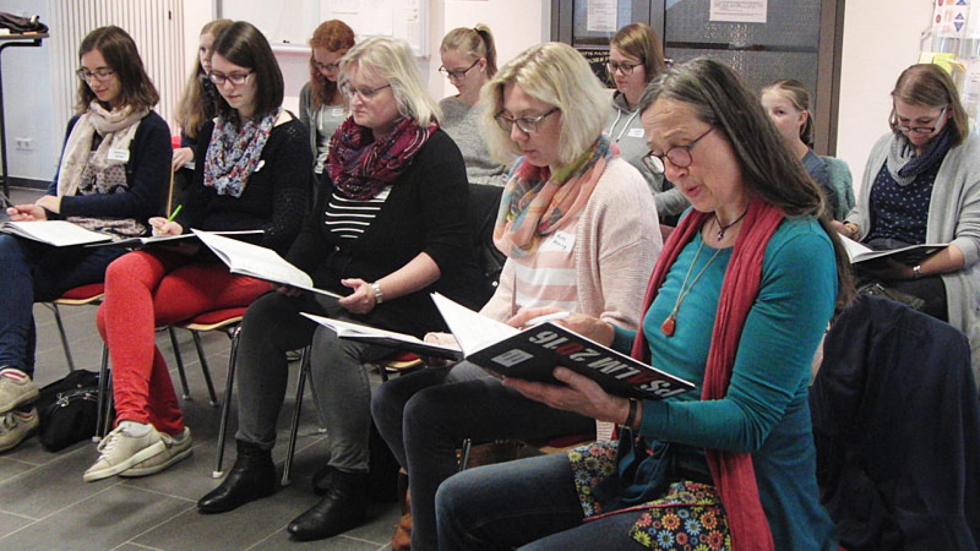 In den Herbstferien ist auf dem Gelände der Berufsbildenden Schulen in der Trägerschaft der Franziskanerinnen in Thuine eigentlich nichts los. Doch wenn man auf das Schulgebäude zukommt, hört man Klaviermusik und Gesang. Die neuen Mitwirkenden des Oratoriums „Psalm 2016“ – Kinder, Jugendliche und Erwachsene aller Altersstufen – proben in der Aula unter der Leitung des Komponisten. Aus ganz Deutschland sind sie nach Thuine gekommen, wo sie sechs Tage lang die Gastfreundschaft der Thuiner Franziskanerinnen genießen und sich singend und bewegend mit den Psalmentexten und der dazugehörigen Musik auseinandersetzen. „Durch diese intensive Arbeit bekommt man inhaltlich sehr viel mit“, sagt Eva Schumacher, Pastoralreferentin aus Lingen.