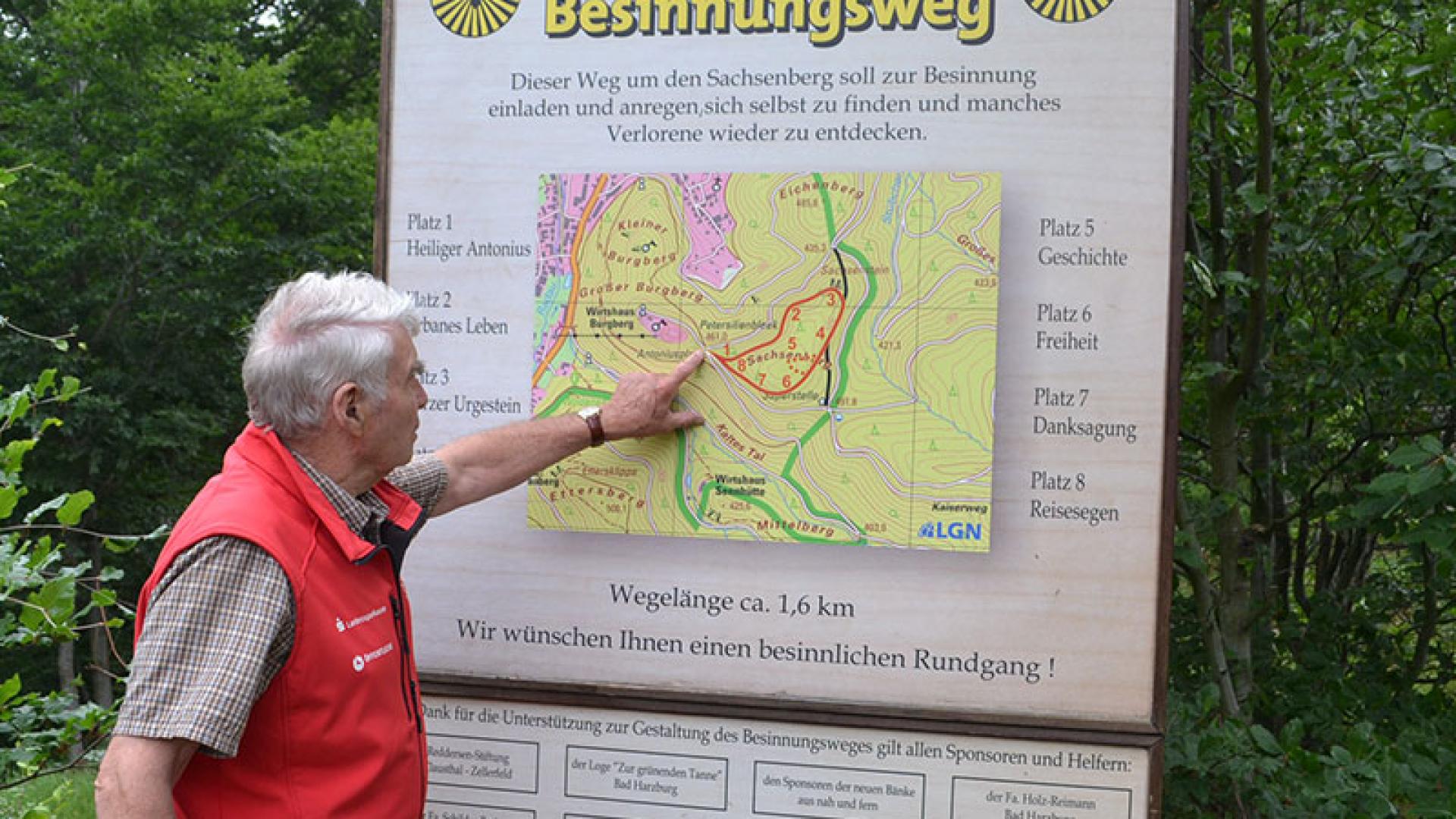 Beim Gang vorbei an insgesamt acht Stationen wie „Himmelsloch“, „Sachsenstein“ oder „Brockenblick“ werden Pilger in wunderbarer Natur zur Besinnung eingeladen und angeregt, sich selbst zu finden. Das helle Grün der umgebenden Baumwipfel blendet die Wanderer fast, der große Fernblick auf das Harzvorland und den Brocken wirkt überwältigend, etliche atmen auf. „Ist das eine schöne Luft hier, sagen viele Leute“, erzählt Wanderführer Horst Woick. Er hat den Weg konzipiert und ist Ehrenvorsitzender des Fördervereins Historischer Burgberg Bad Harzburg. Interessierte erfahren von ihm auch einiges über Waldbau und Geologie, sowie den Eingriff des Menschen in die Natur.