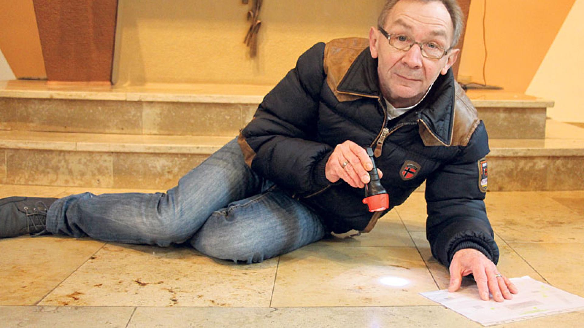 Im vergangenen Jahr hat der Neuenhauser die drei Gotteshäuser in der Grafschaft Bentheim tagelang nach solchen Spuren untersucht – zur Freude und großen Begeisterung von Pfarrer Hubert Bischof. Auf Knien rutscht Peter Richter über die Fußböden in Altarräumen, Sakristeien und Treppenstufen und schaut sich jeden Zentimeter sorgfältig an. Was andere Leute vielleicht für Kratzer oder Muster im Stein halten, fällt seinem geübten Auge als Überreste versteinerter Lebewesen schnell auf. „Es gibt überraschend viele Arten in hoher Konzentration, besonders in Veldhausen“, sagt er und zeigt noch weitere Funde. Akribisch zeichnet er die Fundstellen in einen Plan, macht Fotos und schreibt Erklärungen dazu. Seine Dokumentation füllt mittlerweile mehrere Mappen. Ende Februar will er die Ergebnisse bei einem Gemeindefrühstück nach dem Hochamt präsentieren. Mancher Zuhörer wird danach beim Kirchgang vielleicht öfter mal aufmerksam nach unten schauen.