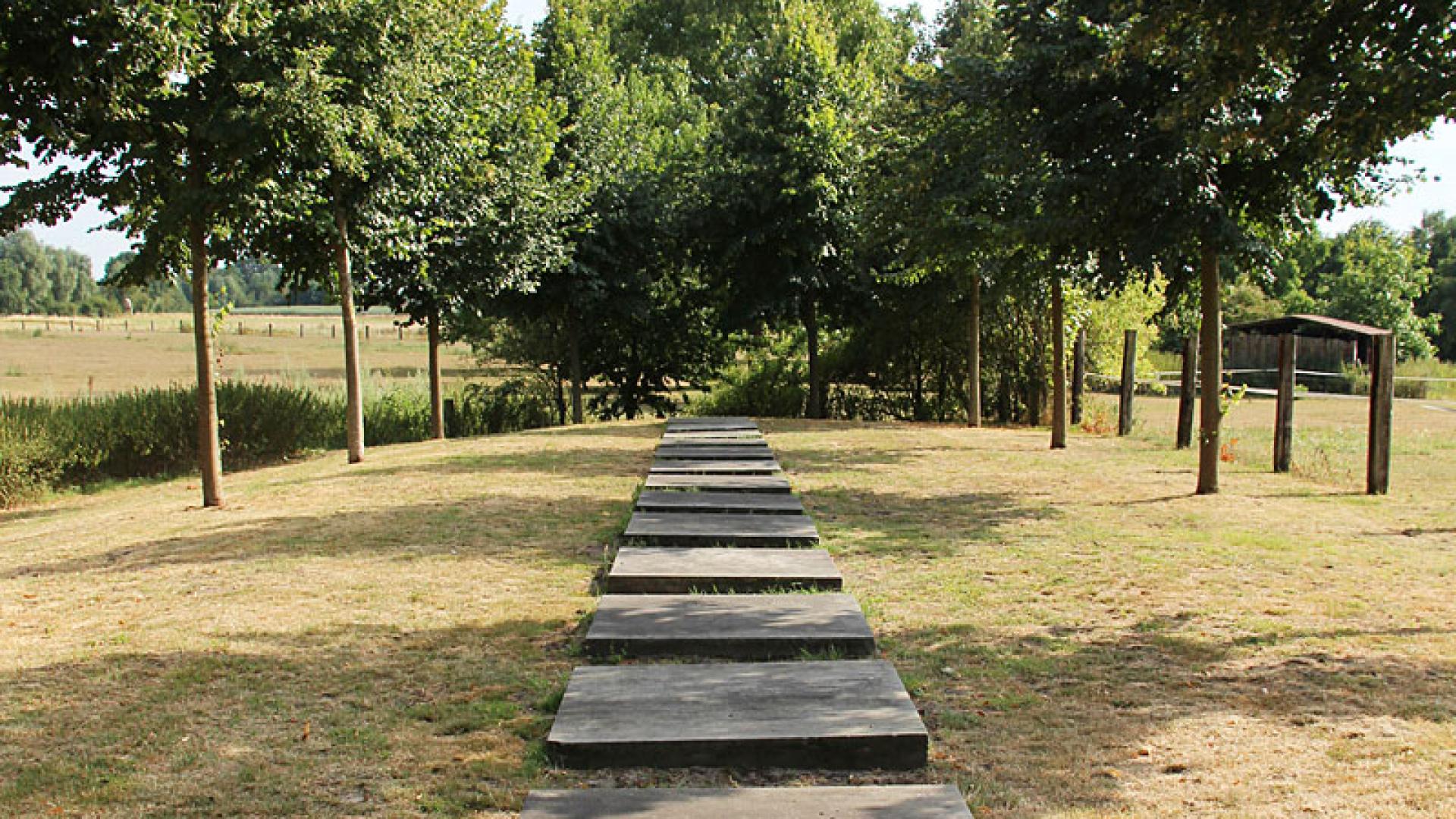 Am Vechteufer, nicht weit von der Innenstadt, lässt sich gut durchatmen und den Lärm der Stadt vergessen. In sanftem Bogen führt ein Weg entlang des schmalen Flüsschens: vorbei an Baumreihen und Waldstücken, an Wiesen und Feldern. Bevor der Wanderer dann eine kleine Anhöhe hinauf zum Kloster Frenswegen geht, kommt er an zwei Kunstwerken vorbei. Direkt an der Böschung stehen zwei große Sandstein-Stelen von Michael Schoenholtz. Wie durch ein Tor kann man von dort auf das Wasser schauen und einen Moment innehalten. Genau wie ein paar Schritte weiter bei der Arbeit von Karl Prantl: 14 Bodenplatten liegen unter den Bäumen, aufgereiht zu einem „Kreuzweg“ – wie die 14 Stationen von der Verurteilung Jesu bis zu seinem Tod. Ein ebenso schlichtes wie eindringliches Bild, an dem keiner schnell vorbeilaufen sollte.