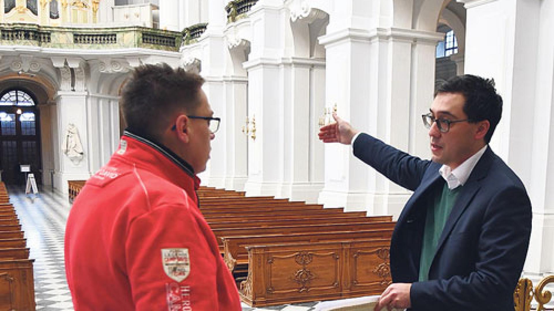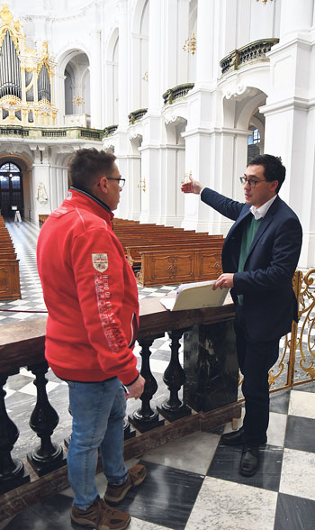 | Samuel-Kim Schwope (rechts) mit Kathedralküsterin Elisabeth Woelki bei Planungsabsprachen zum Ablauf der Gottesdienste während der Vollversammlung. Foto: Michael Baudisch |