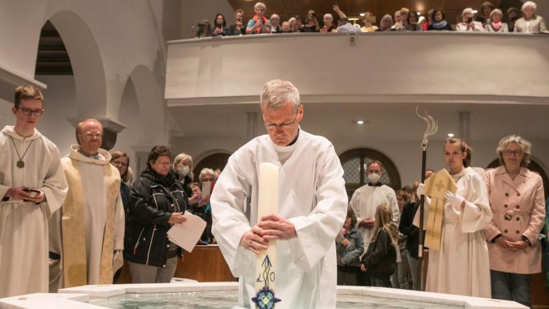 Bei einem feierlichen Abendgebet unter ökumenischer Beteiligung hat Bischof Heiner Wilmer das erste Ganzkörper-Taufbecken im Bistum in der Wolfenbütteler St. Petrus Kirche geweiht. Dabei stand er mit der brennenden Osterkerze im Wasser.