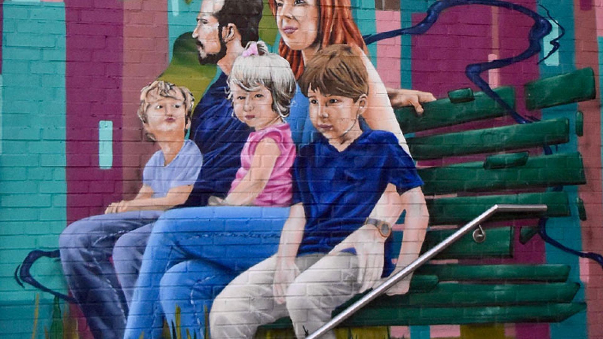 Jascha Müller kann sich in diesem Motiv gut wiederfinden: Er ist selbst verheiratet und Vater zweier Kinder. Ein bisschen erinnert sein Werk an der Fassade der FABI an eine Illustration aus einem Kinderbuch – und das ist etwas, was Generationen verbindet: Vorlesen, gemeinsam Bilder erkunden. Es geht ihm um ein für den Raum und den Auftraggeber passendes Kunstwerk. Eine „frische Note“, wie er es nennt – das ist es, was er einbringen möchte.