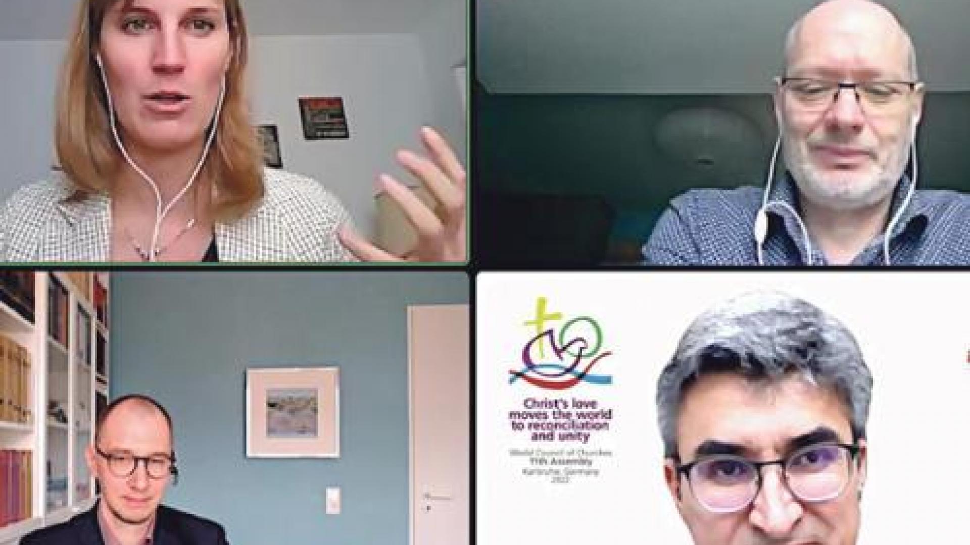 | Verena Hammes von der ACK Deutschland, daneben Hans Joachim Ditz vom Ökumenischen Rat Berlin-Brandenburg, unten: Pastor Dietmar Päschel, Ökumenische Arbeitsgemeinschaft der Freikirchen Berlin-Brandenburg sowie Marc Witzenbacher, Koordinierungsbüro der ÖRK-Vollversammlung. Foto: Screenshot |