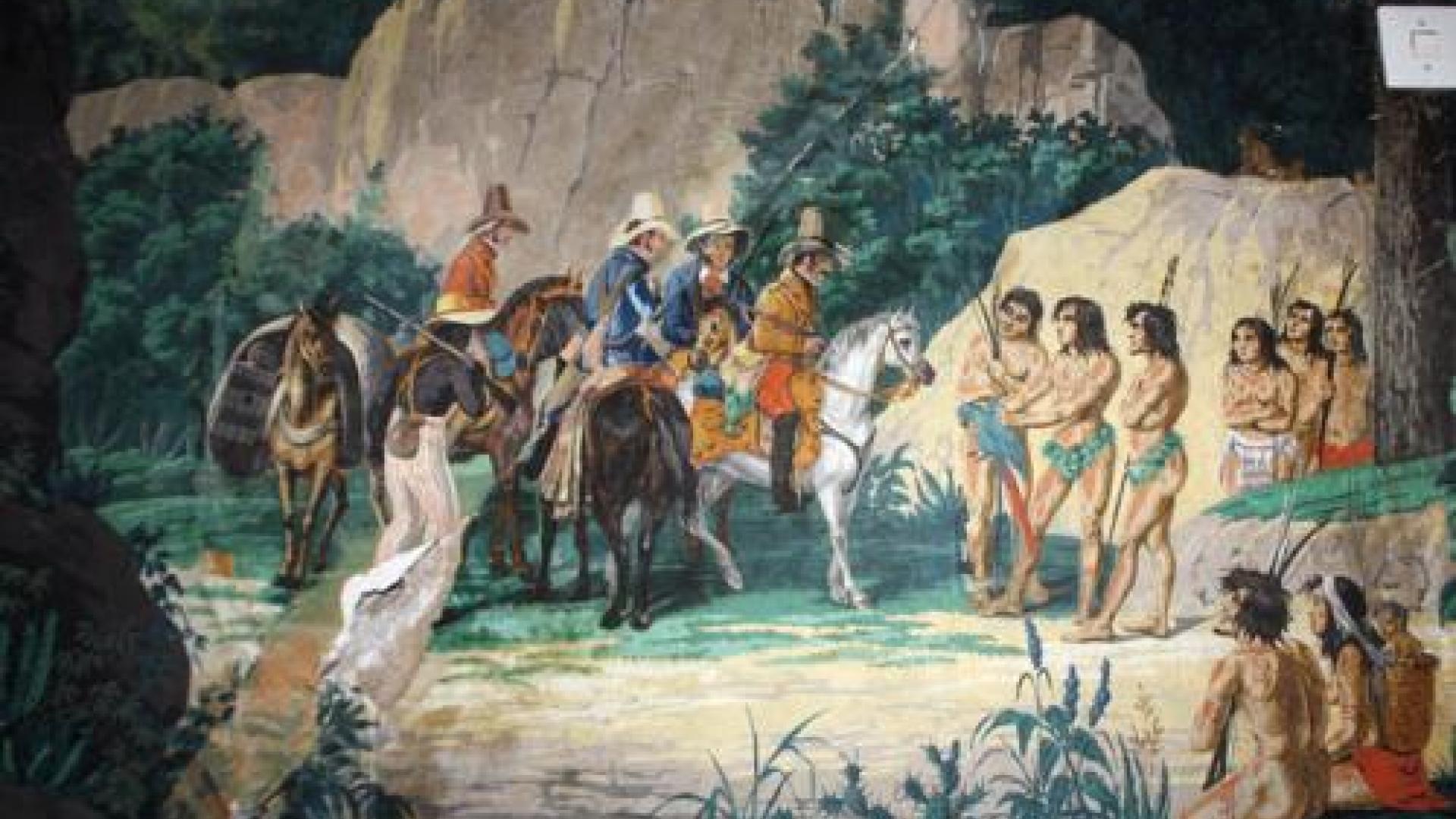 | Eine der Tapeten mit einem Motiv die Landnahme der Europaer in Südamerika. |
