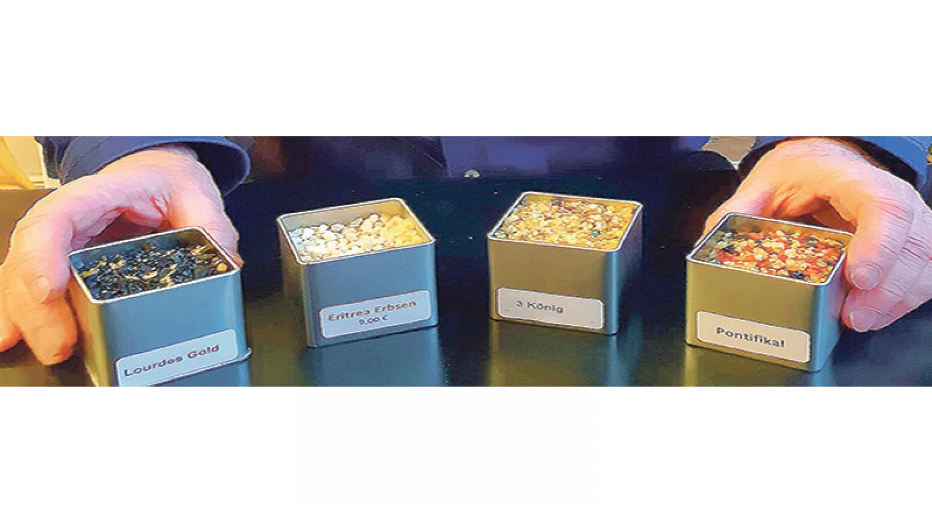 „Lourdes Gold, Dreikönig, Pontifikal“: Die Namen der Weihrauchmischungen hören sich katholisch an. Blumig, intensiv, gemischt mit Lavendel, Rosen, anderen Harzen, und die Luxusvariante, der reine Weihrauch.