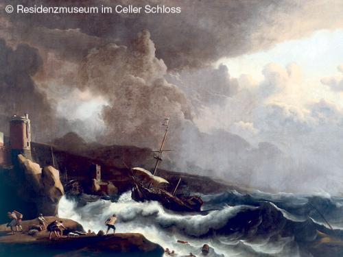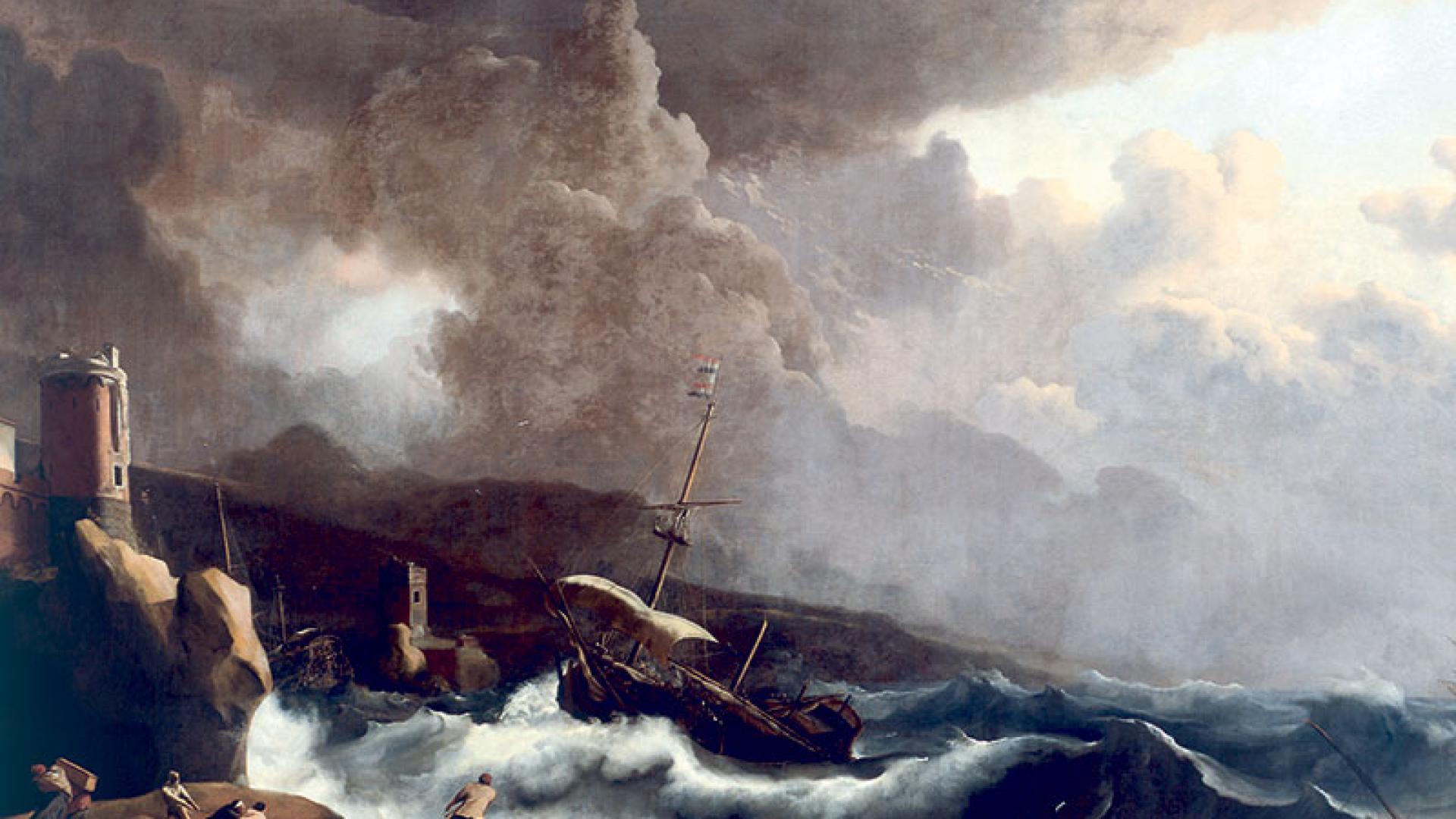Wie eng die Lebens- und Glaubenswelten aufeinander bezogen waren, zeigt auch das großformatige Gemälde „Seesturm mit Schiffbrüchigen“ des niederländischen Malers Ludolf Backhuysen aus den 1680er-Jahren. Ein schwankendes Schiff auf dem aufgepeitschten Meer – dieses Motiv geht auf die frühchristliche Symbolik zurück. Es zeigt den Menschen als Seefahrer auf seiner Lebensreise voller Unwägbarkeiten und Gefahren. Das Schiff, das ihn trägt, ist die Kirche, von Wellen umtost und an manchen Stellen beschädigt. Doch dieses Schiff geht nicht unter. Der Großmast trotzt den Stürmen und ragt wie ein Kreuz in den Himmel, der sich zum Bildrand hin öffnet. Und auch der rettende Hafen ist in Sicht.