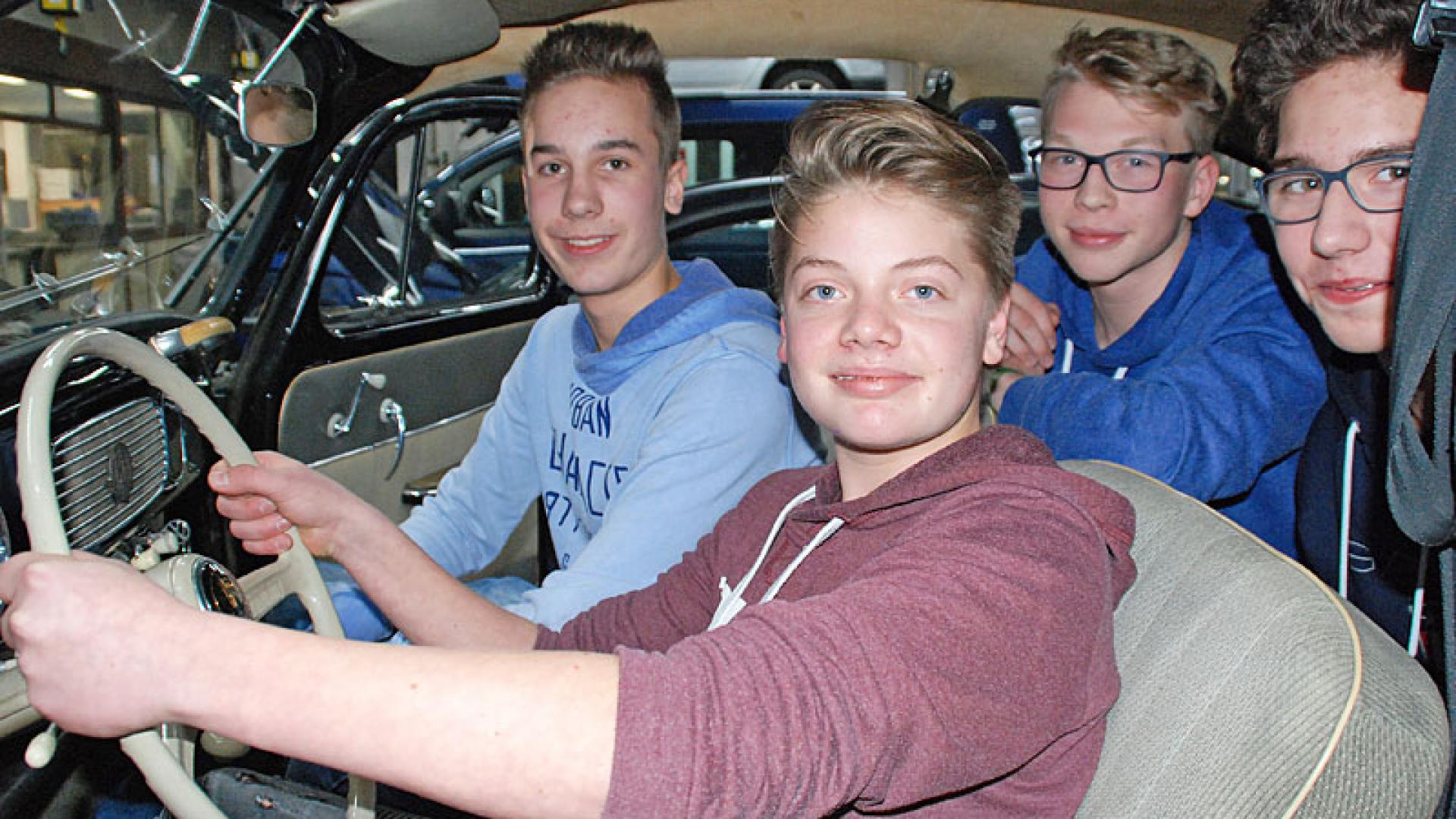 Für die Abschlussveranstaltung hat Geschäftsführer Christian Härtel die Werkstatt gewählt. „Hier ist der Ort des Geschehens. Hier haben die Jungs gestanden und geschraubt.“ Zwei Stunden pro Woche, acht Wochen lang bastelten die Schüler am Motor des VW Käfer. Sie reinigten die Teile und verdichteten Leitungen und Schläuche. Anfang Dezember startete Thomas Nörenberg, Werkstattleiter und fachkundiger Betreuer der vier Schüler, mit den Jungs zur Probefahrt.