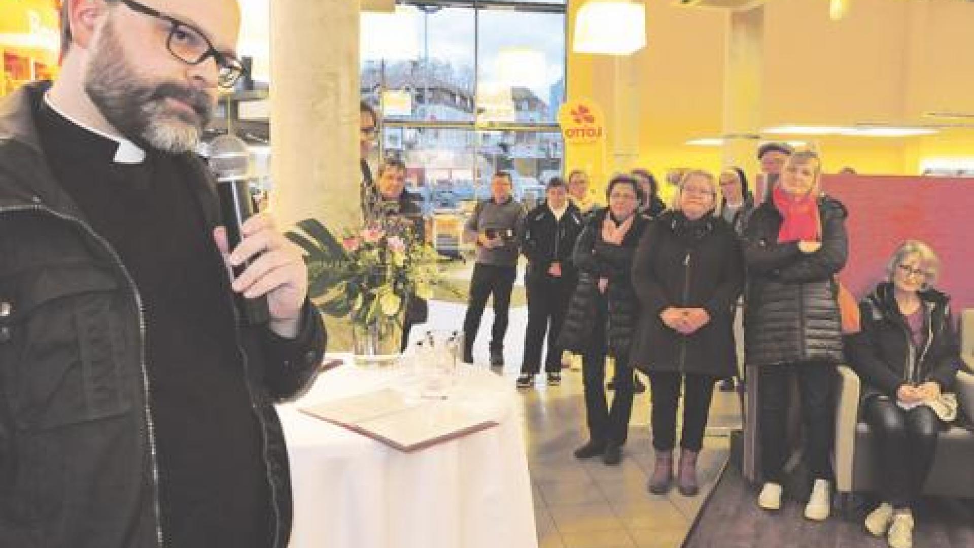 Zum Auftakt versammelten sich die Christen im Worbiser Krankenhaus St. Elisabeth, wo der blinde Bettler Bartimäus aus Jericho, von dem im Neuen Testament die Rede ist, im Mittelpunkt stand. Am Tag darauf drängten schließlich weit mehr als 50 Gläubige in die Cafeteria eines großen Worbiser Verbrauchermarktes, um das vierte Kapitel aus dem Johannesevangelium zu hören. Marktleiter Andre Glahn hatte am Eingang zwei mit weißen Tischdecken gedeckte Stehtische mit jeweils zwei brennenden Kerzen aufgestellt. Aus dem Johannesevangelium, das von Jesus und seiner Begegnung mit der Samariterin berichtet, las der Marktleiter zehn Verse. Die, die gekommen waren, erfuhren von der Frau aus Samarien, die in der Mittagshitze zum Jakobusbrunnen geeilt war, um Wasser zu holen und dort auf Jesus trifft. In seiner Auslegung des Bibeltextes griff Kaplan Johannes Kienemund dann die Begebenheit am Brunnen auf, wo Jesus die Samariterin um Wasser bittet, weil ihn dürstet. Wie alle Menschen habe Jesus das Bedürfnis zu trinken, meinte der Geistliche. Da rede kein über den Wolken thronender Gott, da rede jemand, der ein bedürftiger Mensch sei. „Und da kommt eine Frau, um ihren Wasserkrug zu füllen. Sie sucht Erfüllung“, so Kienemund in seiner Interpretation der Bibelverse.