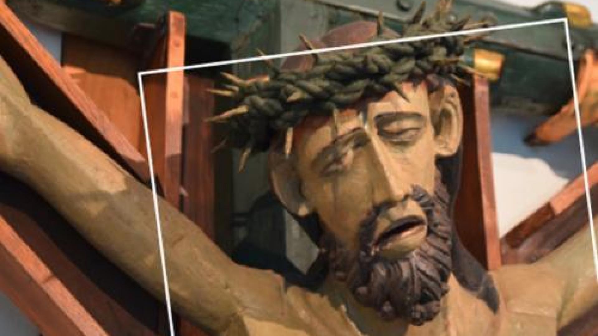 Schmerz und Erschöpfung stehen der Jesus-Figur am Lager Kreuz in Rieste ins Gesicht geschrieben. Gläubige tragen das Kreuz, um für Kranke und Sterbende zu beten. Foto: Christoph Brüwer