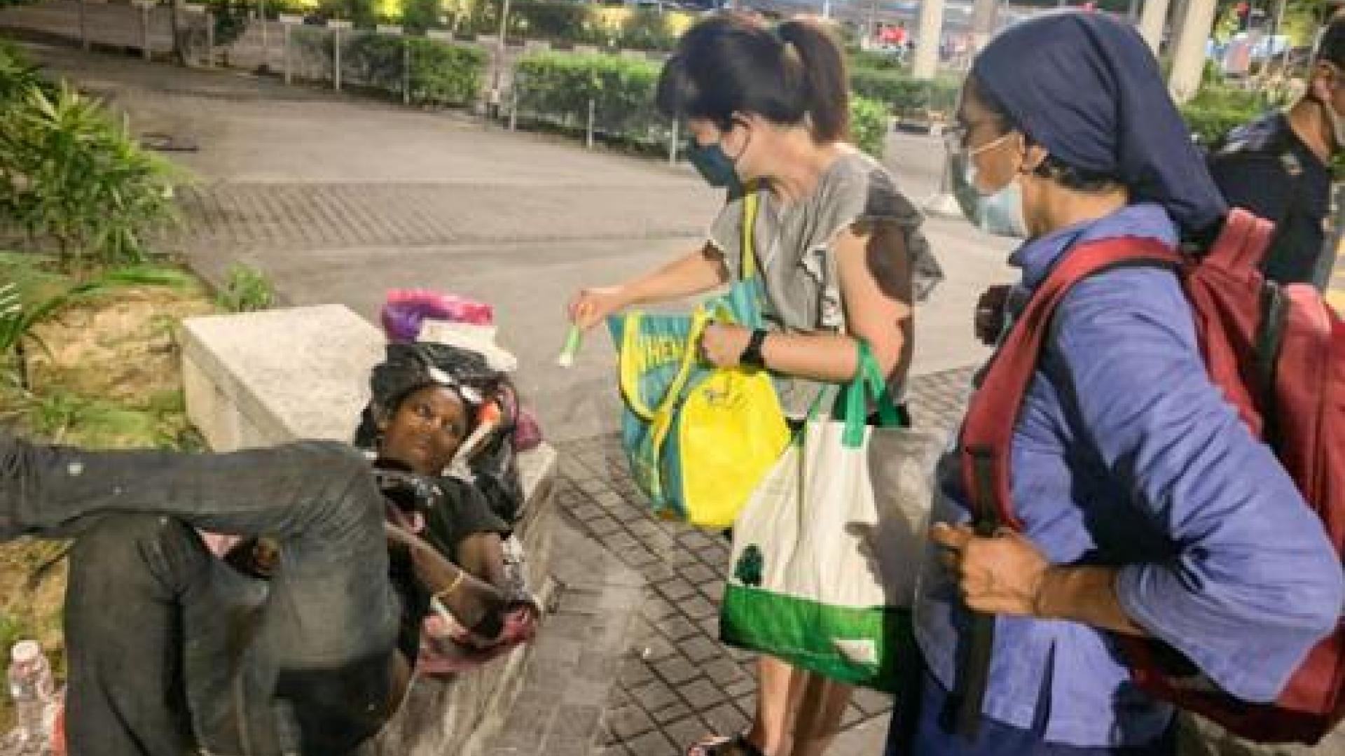 Die kleine Truppe schleppt in der heißen Tropennacht schwere Taschen mit Wasserflaschen, Essensrationen, Hygieneartikeln, Medikamenten und Anti-Moskito-Spiralen, die sie an Obdachlose verteilen. Nahe einem Hindu-Tempel am Rand des chinesischen Viertels kauern zehn von ihnen. "Hier geben wir kein Essen aus", sagt die 56-Jährige und fügt hinzu: "Die werden vom Tempel mit Mahlzeiten versorgt."