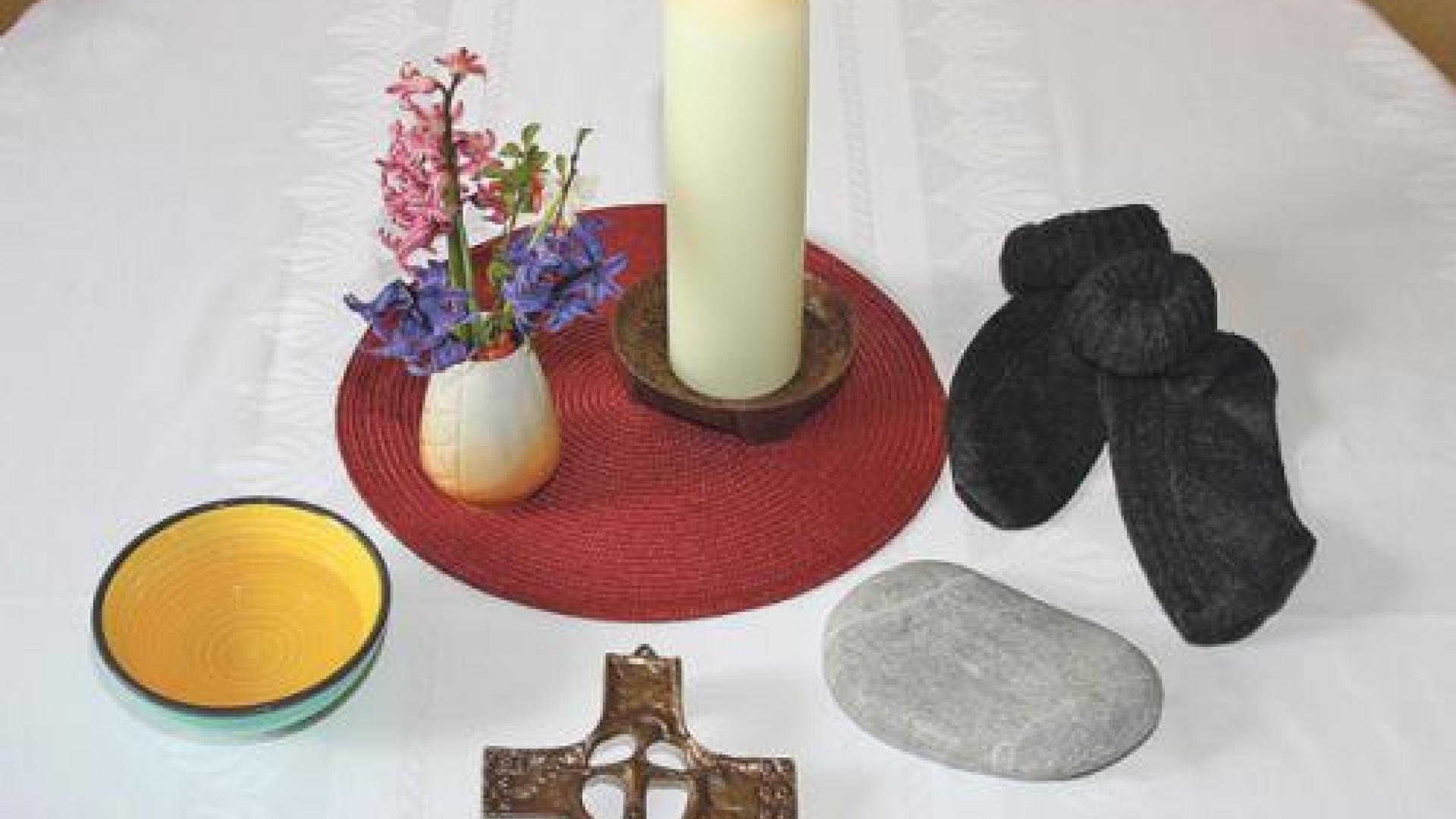 | „Osterecke“ mit einer Wasserschale, Kreuz, einem Stein, der Osterkerze, Blumen und Socken (anstelle von Schuhen!). Foto: Eckhard Pohl |