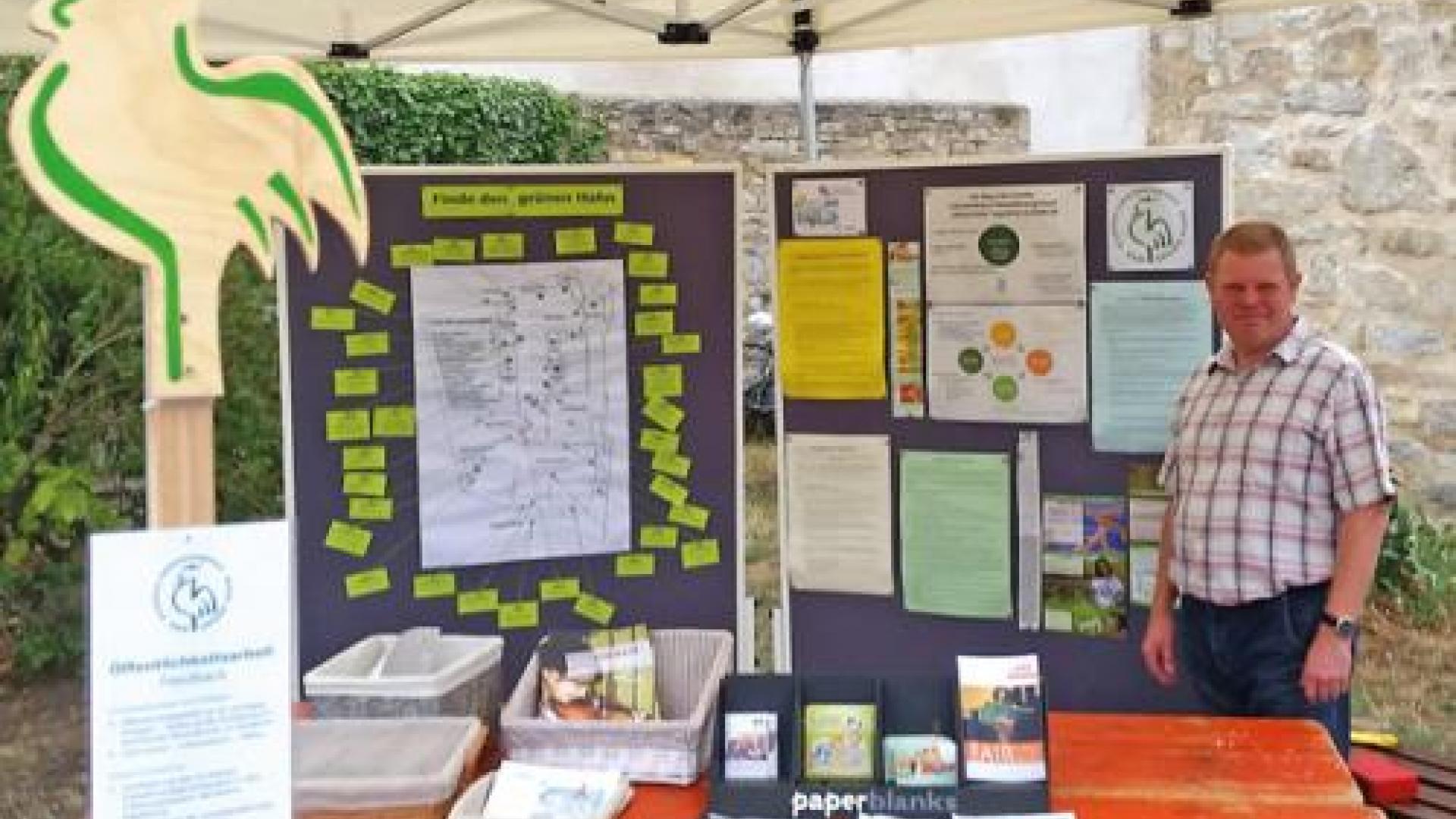 | Wendelin Bücking ist ehrenamtlicher Umweltbeauftragter des Bistums Magdeburg. Das Bild zeigt ihn bei der Wallfahrt des Bistums 2018 auf der Huysburg bei Halberstadt. Dort wurde mit einer Aktion für die Zertifizierung mit dem kirchlichen Umweltlabel „Grüner Hahn“ geworben. | Foto: privat |