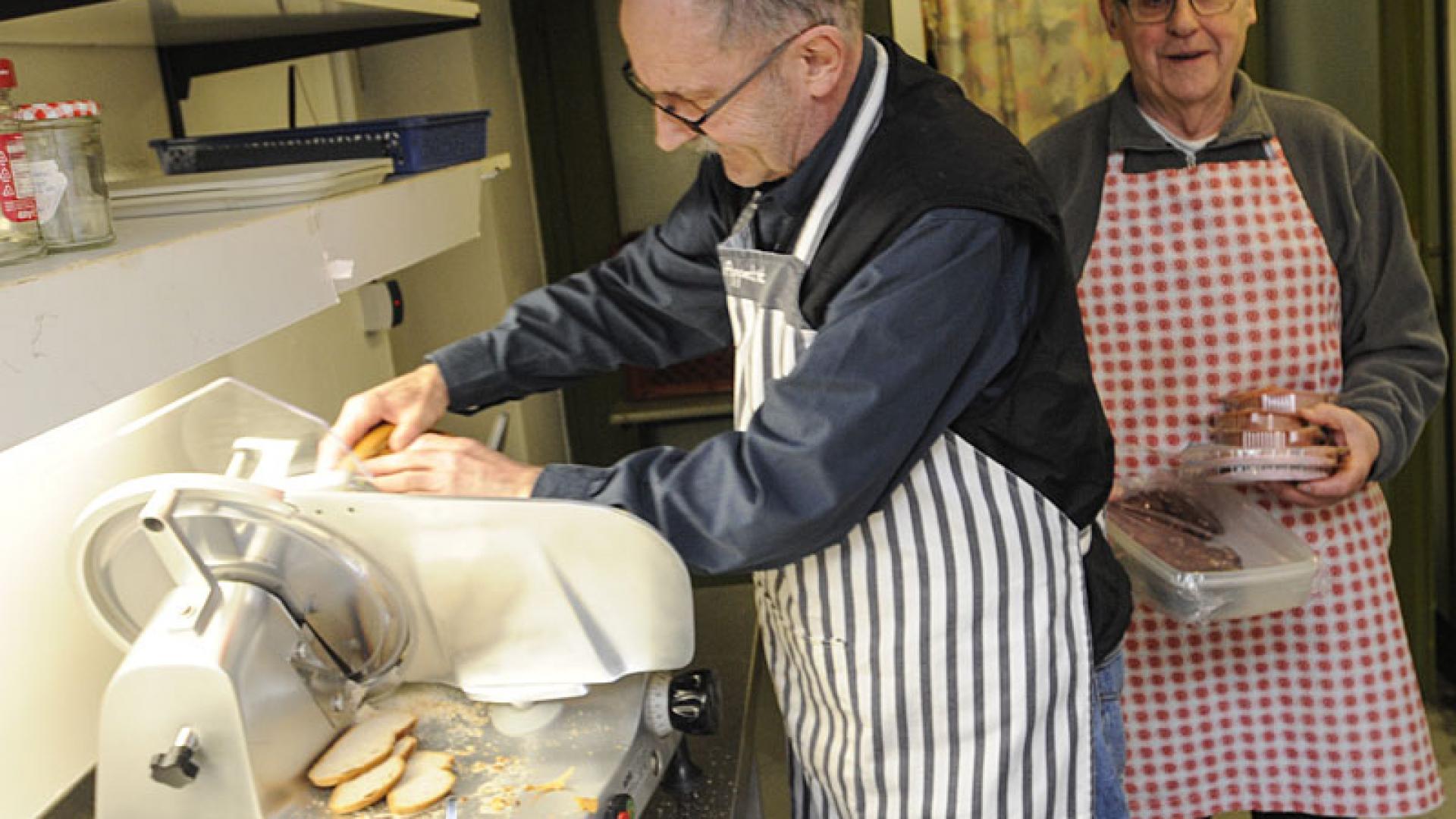Im Nebenraum rattert die Brotschneidemaschine. Zum Abendbrot bekommen alle Besucher ein Päckchen mit fertig geschmierten Brotscheiben mit auf den Weg. Dafür sind Willi Ahrens und Klaus Hackmann heute zuständig. Die beiden Rentner gehören einer Männer-Kolpinggruppe an, die sich seit fast zehn Jahren in der Wärmestube engagiert. 320 Scheiben werden geschnitten, geschmiert, mit Aufschnitt belegt und verpackt. Jeden Tag. „Es macht Spaß, man kann anpacken, etwas Sinnvolles tun. Wir haben ja Zeit“, erzählen die Männer übereinstimmend.