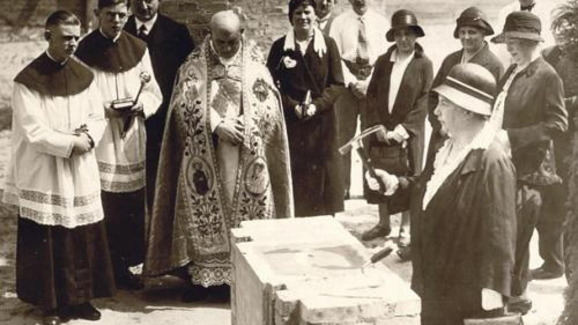 | Grundsteinlegung für das Wohnheim in der Wundtstraße: Die erste Vorsitzende Maria Heßberger (mit Hammer) spricht einen Segen für das Haus. Foto: Archiv KDFB |
