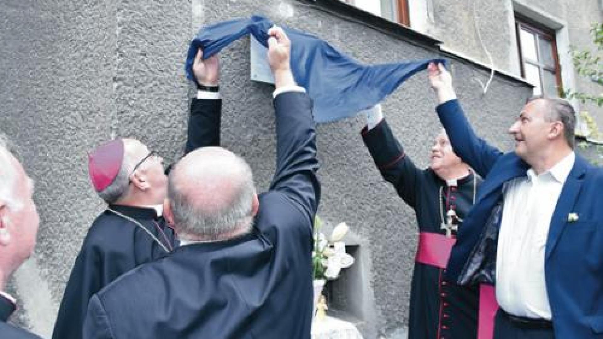 | Gemeinsam enthüllen die beiden Bischöfe und die Bürgermeister von Görlitz und Zgorzelec die Gedenktafel für Pfarrer Franz Scholz, am ehemaligen Pfarrhaus in der Czachowskiego-Strasse 7 in Zgorzelec. | Fotos: Raphael Schmidt |
