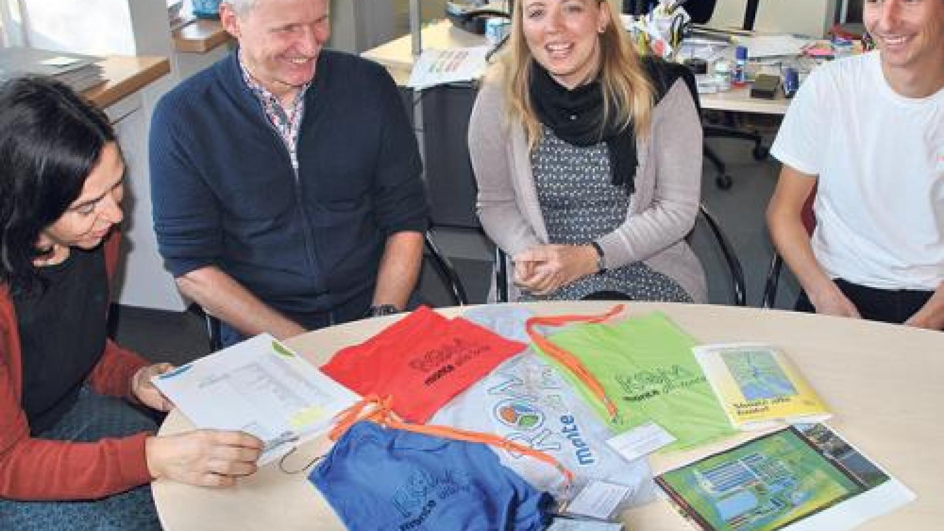 | Die letzten Planungstreffen im Büro des Schulleiters Sebastian Heider (Zweiter von links): Ana Timon, Theresa Brekle und Lukas Moosdorf (von links) präsentieren T-Shirts, Programmheft und Namensschilder für die Romfahrt der rund 680 Mitfahrer. Foto: Ruth Weinhold-Heße |