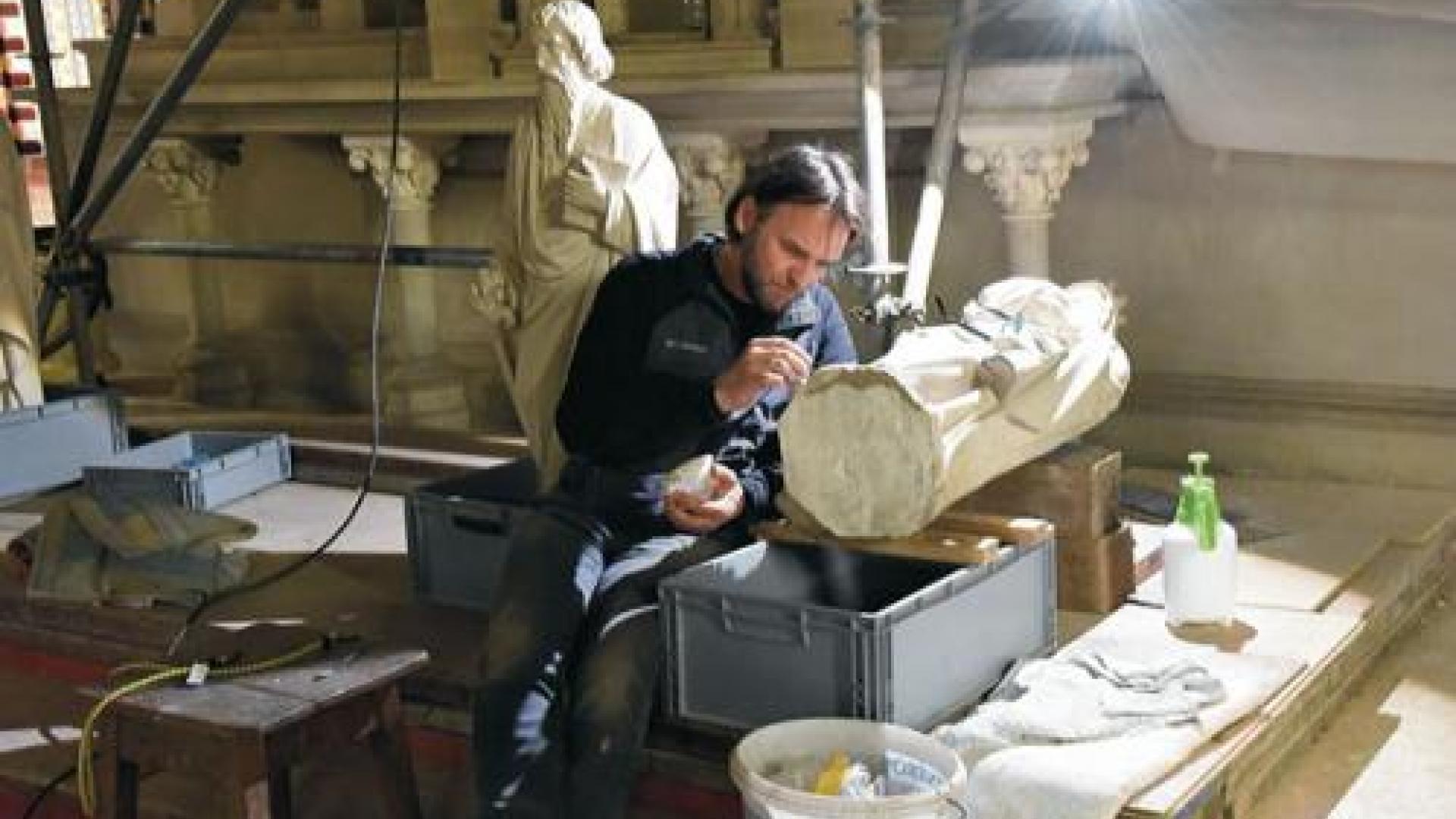 Bohrhämmer donnern mit dumpfem Dröhnen ihre Meißel in die Wände, während an anderen Stellen hohe Stimmen von Bohrmaschinen zu hören sind. Der Raum kennt normalerweise Orgelkang und Stimmen von Bass bis Sopran. Doch derzeit bestimmen in der Kathedrale Sankt Jakobus in Görlitz Handwerker und Bauleiter, welche Melodien wann gespielt werden. Vom Altarraum hingegen kommt kein Lärm. Dort beugt sich Restaurator Uwe Konjen über die heilige Elisabeth aus Sandstein und repariert den Sockel, auf dem sie normalerweise steht – so wie die Bistumsheilige Hedwig und zwei weitere Heiligenfiguren im Hochaltar. Der Stein-Fachmann richtet den Tageslicht-Scheinwerfer neu ein – es kommt bei seiner Arbeit auf Details an. Der Auftrag an Restaurator Konjen lautet: Restaurierung des Hochaltars und der Kanzel. Die muss noch warten. Die Arbeitsabläufe sind festgelegt – für die Kanzel braucht es keine Gerüste mehr, mit denen der Hochaltar eingerüstet ist.
