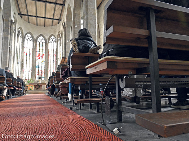 | Die St. Petri-Kirche in Magdeburg verfügt wie viele ältere Kirchen im TAG DES HERRN-Verbreitungsgebiet über Heizstrahler, die unter den Bänken installiert sind – eine Technik, die in der Regel viel Strom verbraucht. Foto: imago images/Heike Lyding |