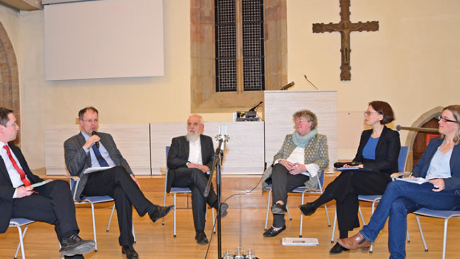 | Moderator Niklas Wagner, Professor Benedikt Kranemann (Liturgik), Ökumene-Bischof Gerhard Feige, Professorin Dorothea Sattler (Ökumene/Dogmatik), Professorin Miriam Rose (Systematische Theologie), Professorin Julia Knop (Dogmatik). Foto: Eckhard Pohl |