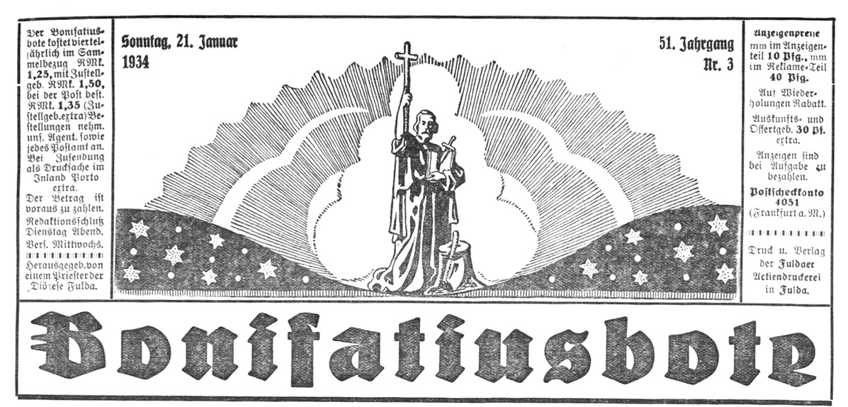 Bonifatius auf dem Titelblatt veränderte im Lauf der Jahrzehnte sein Aussehen. Hier kernig im Jahr 1935.