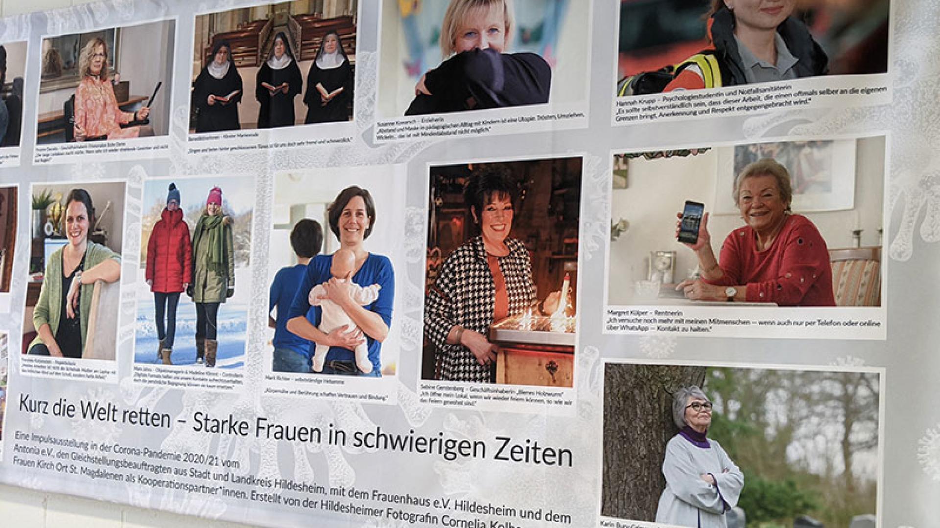 Cornelia Kolbes Hoffnung für die Ausstellung ist, dass sie zumindest unterhält. Angestoßen hat die Aktion Rita Thönelt von Antonia e.V. Die Idee kam ihr durch die Themenwoche „Wirtschaften in der Coronakrise“ beim Hildesheimer Bürgerfunk Radio Tonkuhle. Nach einem Austausch mit der Fotografin und der Suche nach Sponsoren wirbt nun ein Plakat mit einer Rettungssanitäterin an der Glaswand von Antonia in der Andreaspassage für die Ausstellung. Innen hängen an den weißen Wänden weitere Banner, übersät mit kleinen Fotos der einzelnen Frauen. Besonders daran ist, dass neben den Bildern beispielsweise auch persönliche Briefe über die Herausforderungen während der Coronazeit zu lesen sind.