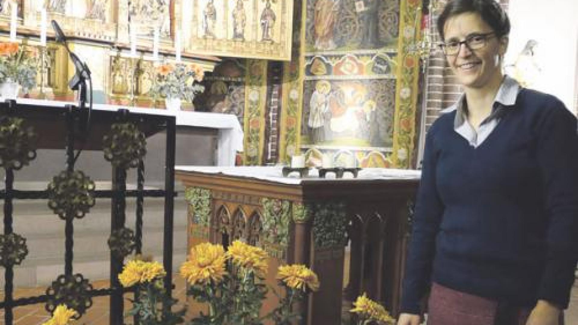 | Gisela Handke am Altar ihrer Kirche. Auch an anderen Festen – so an Weihnachten – übernimmt sie die Gestaltung. Eingeführt wurden auch Kräutersträuße zum Fest Mariä Himmelfahrt. Foto: Andrea von Fournier |