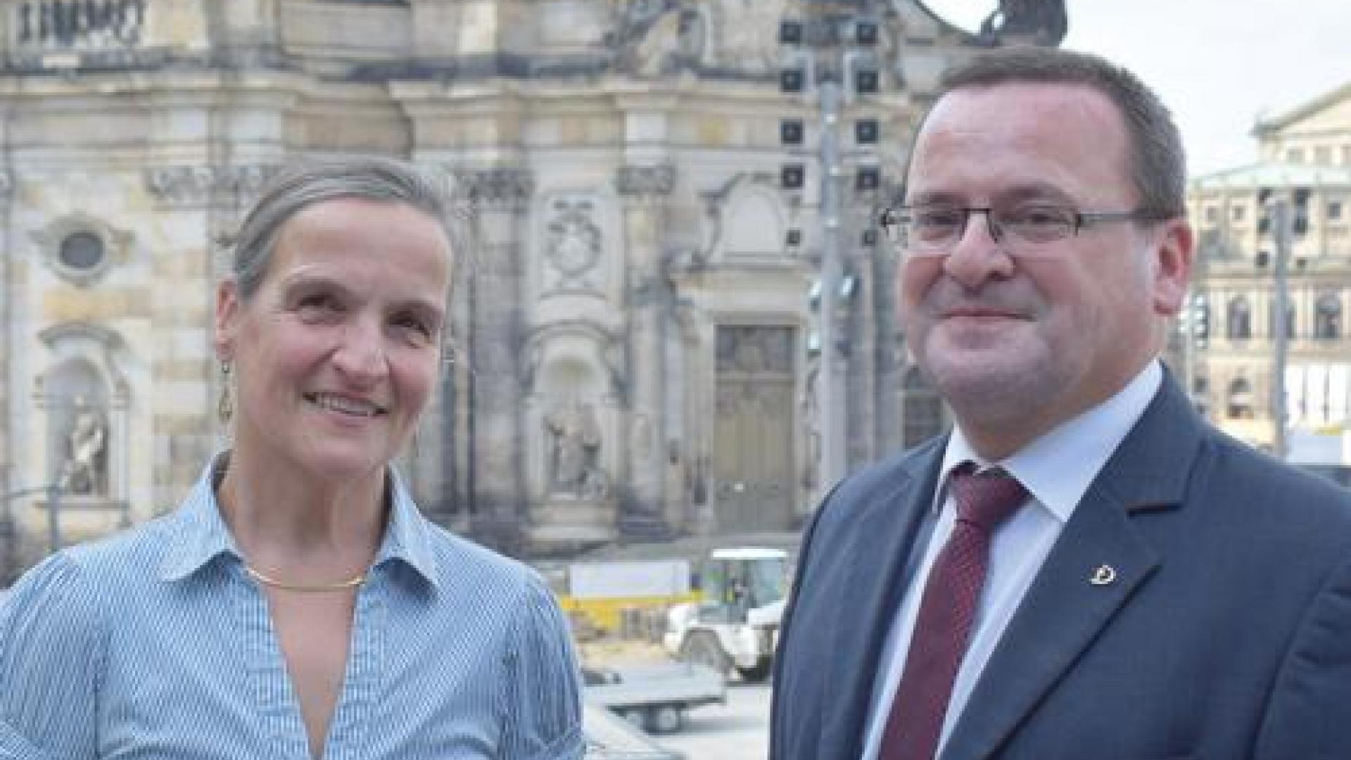 | Vor der Dresdner Kathedrale: Diakon Daniel Frank und seine Sekretärin Christina Hille, die gemeinsam mit ihm vor einem Jahr den Dienst im Katholischen Büro Sachsen antrat. | Foto: Dorothee Wanzek |