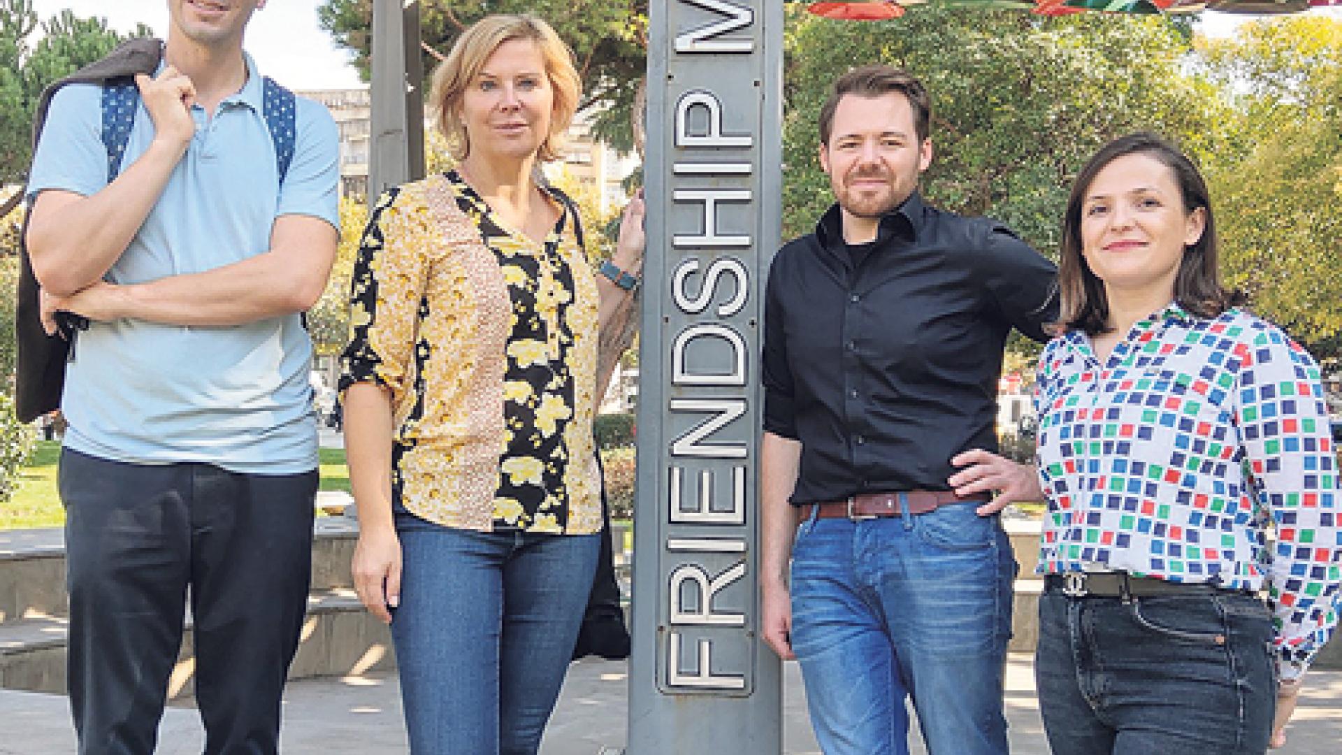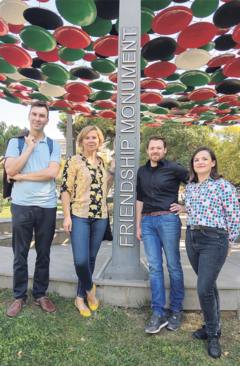 | Pflegedirektorin Juliane Bosch (Zweite von links) und Simon Jäger von der Agentur „Re-Alis“ (Zweiter von rechts) vor dem Friendship Monument (Denkmal für die Freundschaft) in Tirana (Hauptstadt von Albanien). Sie werden von Martin Jehle, Justiziar von Caritas Gesundheit Berlin, und einer Mitarbeiterin von „Re-Alis“ begleitet. Foto: Caritas Gesundheit Berlin gGmbH |