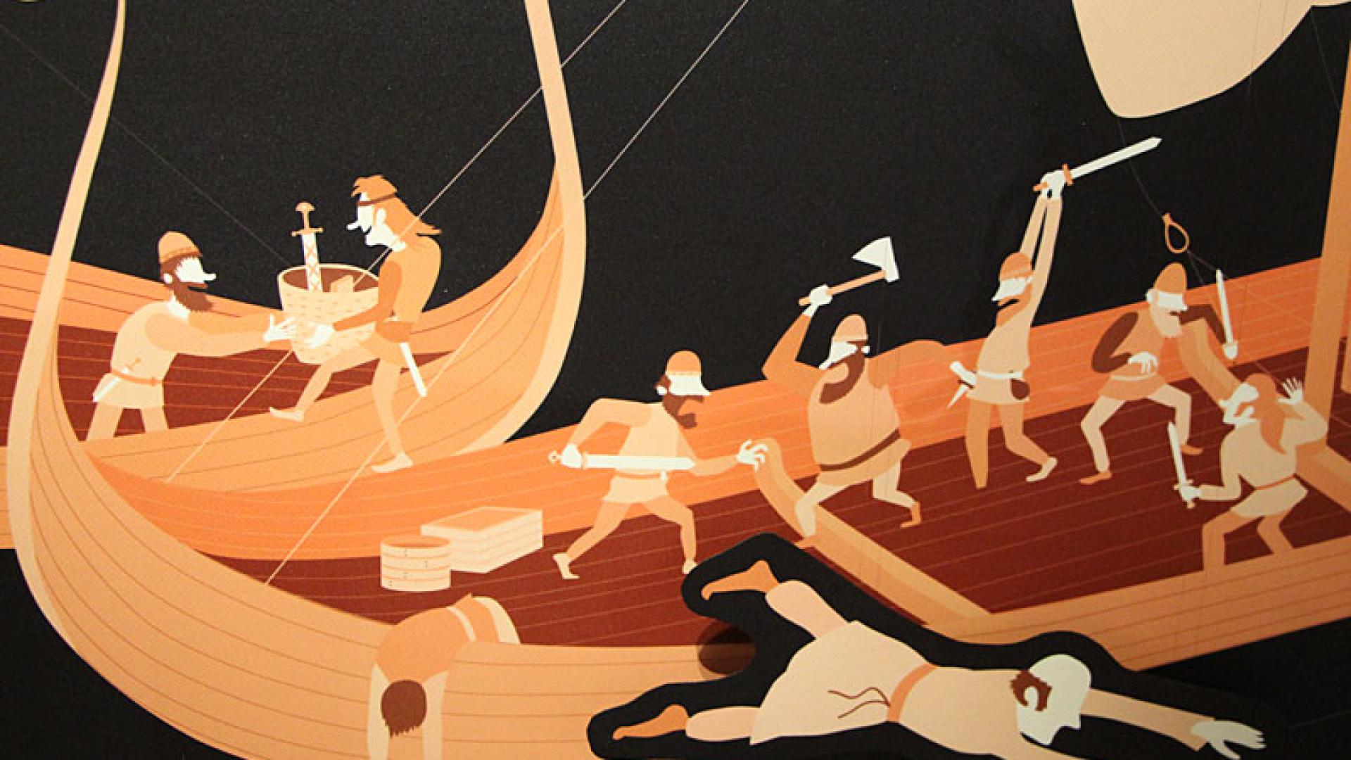 Die kleine Ausstellung erzählt Geschichten über den Zauber dieses Anfangs – von Bischöfen, Königen, Päpsten, Gelehrten, Händlern, Mönchen und Kriegern. Sonja Kinzler gefällt besonders gut, dass die Geschichten auch aus skandinavischer Sicht dargestellt werden – „und dass wir archäologische Quellen aus dem Frühmittelalter mit eigens angefertigten Illustrationen von Schlüsselszenen kombinieren können“. Eine solche Schlüsselszene ist beispielsweise Ansgars Sprung über Bord eines Wikingerschiffes im Jahr 829.