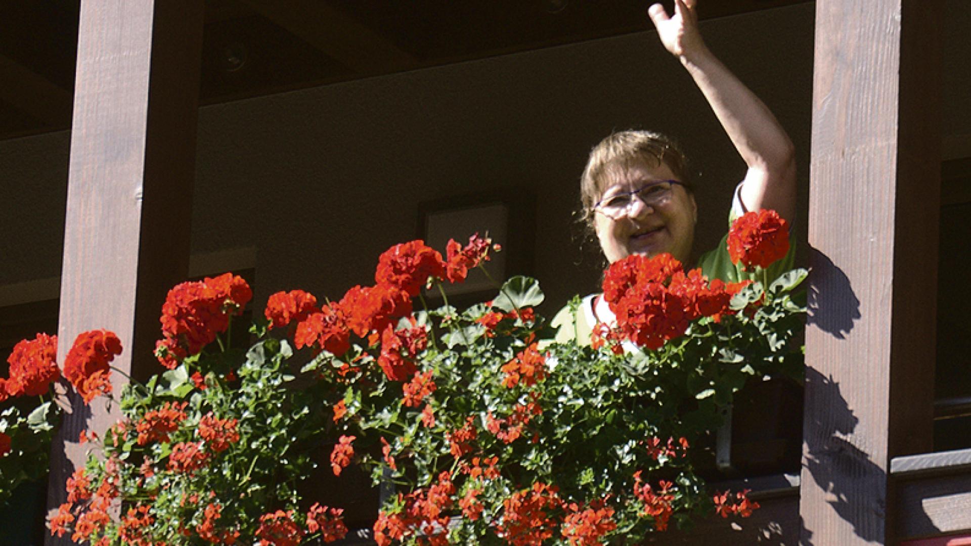 Der Geranienbalkon beeindruckte Marion Zimmermann schon als Kind. Fürs Foto steht sie erstmals selbst oben. Foto: Jens Daniel Schubert |