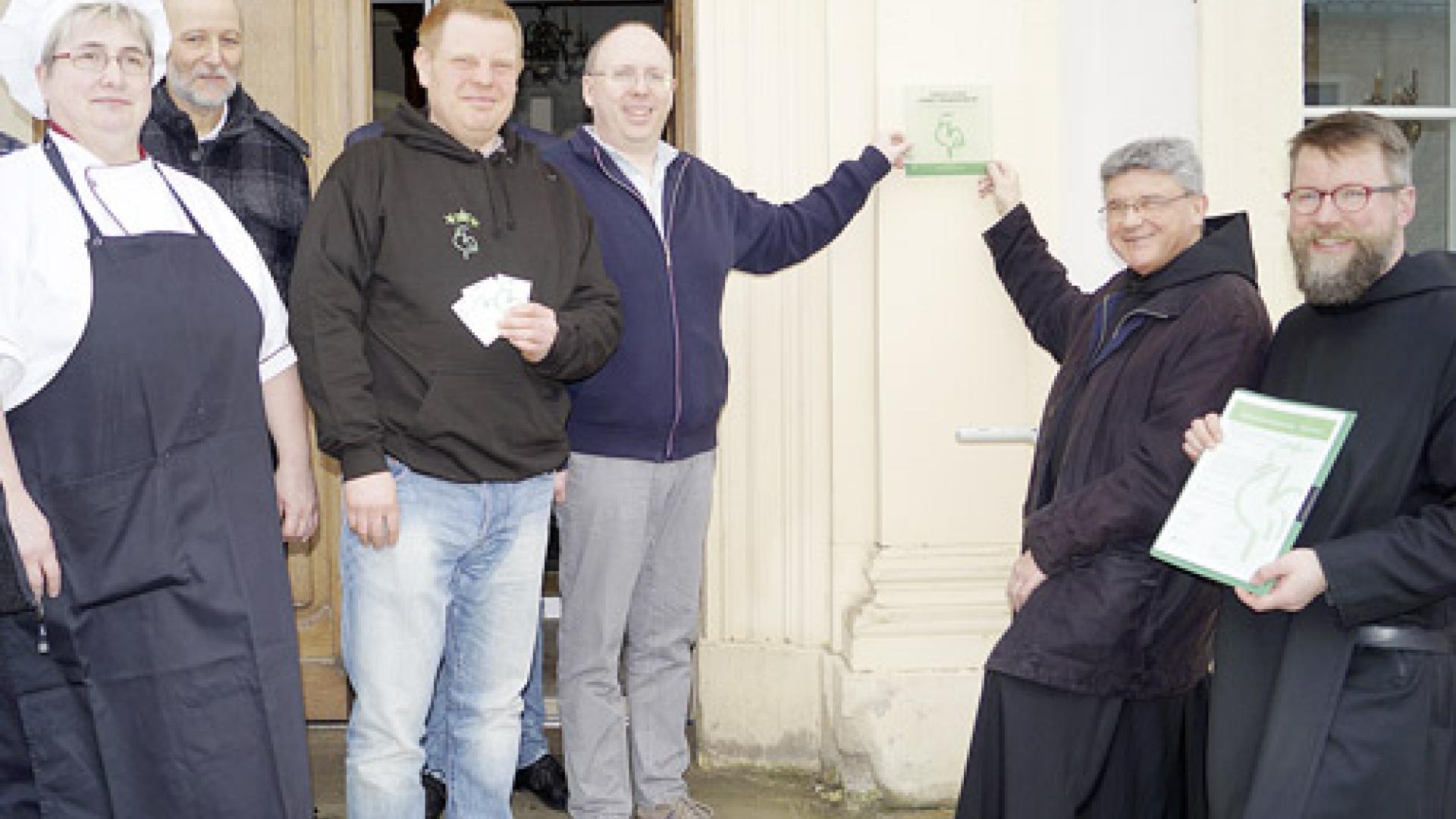 | Die Huysburg darf das Umwelt-siegel „Grüner Hahn“ führen: Küchen-Chefin Karola Klinkmann, Prüfer Bernd Brinkmann, Umweltbeauftragter Wendelin Bücking, Prokurist Michael Kirnich, Prior Antonius Pfeil, Geistlicher Leiter des Ekkehard-Hauses, Bruder Jakobus Wilhelm. | Foto: Uwe Kraus |