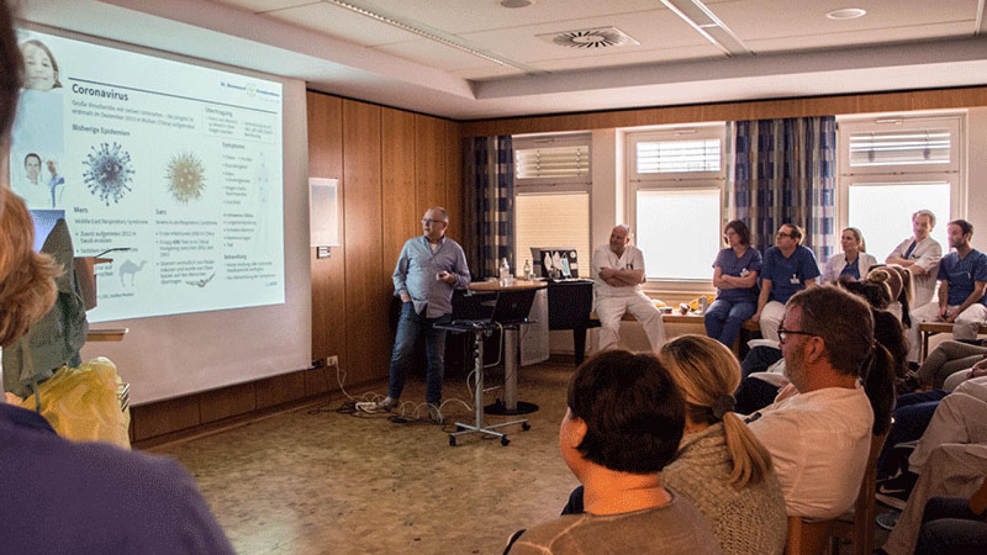 Im Halbstundenrhythmus, zwei Tage lang veranstaltet das St. Bernward Krankenhaus in Hildesheim Schulungen für seine Mitarbeiter. Sie werden aufgeklärt über das Corona-Virus, wie man sich im klinischen aber auch im ganz normalen Alltag schützen kann und natürlich den Umgang mit Erkrankten. „Menschen, die Symptome zeigen, aber keinen Kontakt mit Infizierten hatten oder nicht vor Kurzem in einem der betroffenen Länder waren, haben den Virus vermutlich auch nicht“, sagt Thorsten Luersen, Oberarzt der Anästhesie im St. Bernward Krankenhaus.