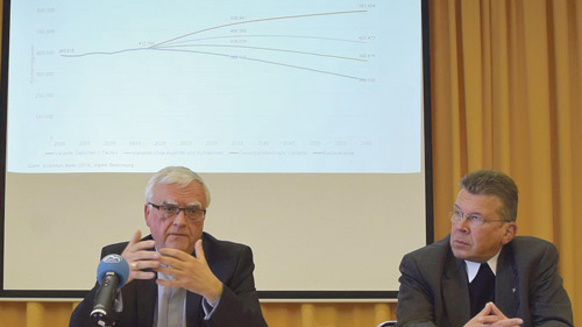 | Finanzbereichsleiter Bernd Jünemann, Erzbischof Heiner Koch und Generalvikar Pater Manfred Kollig (von links) stellen die Projektion der zukünftigen Kirchenmitgliederzahlen im Erzbistum vor: Wenn alles weitergeht wie bisher, werden sie massiv sinken. | Foto: Cornelia Klaebe |