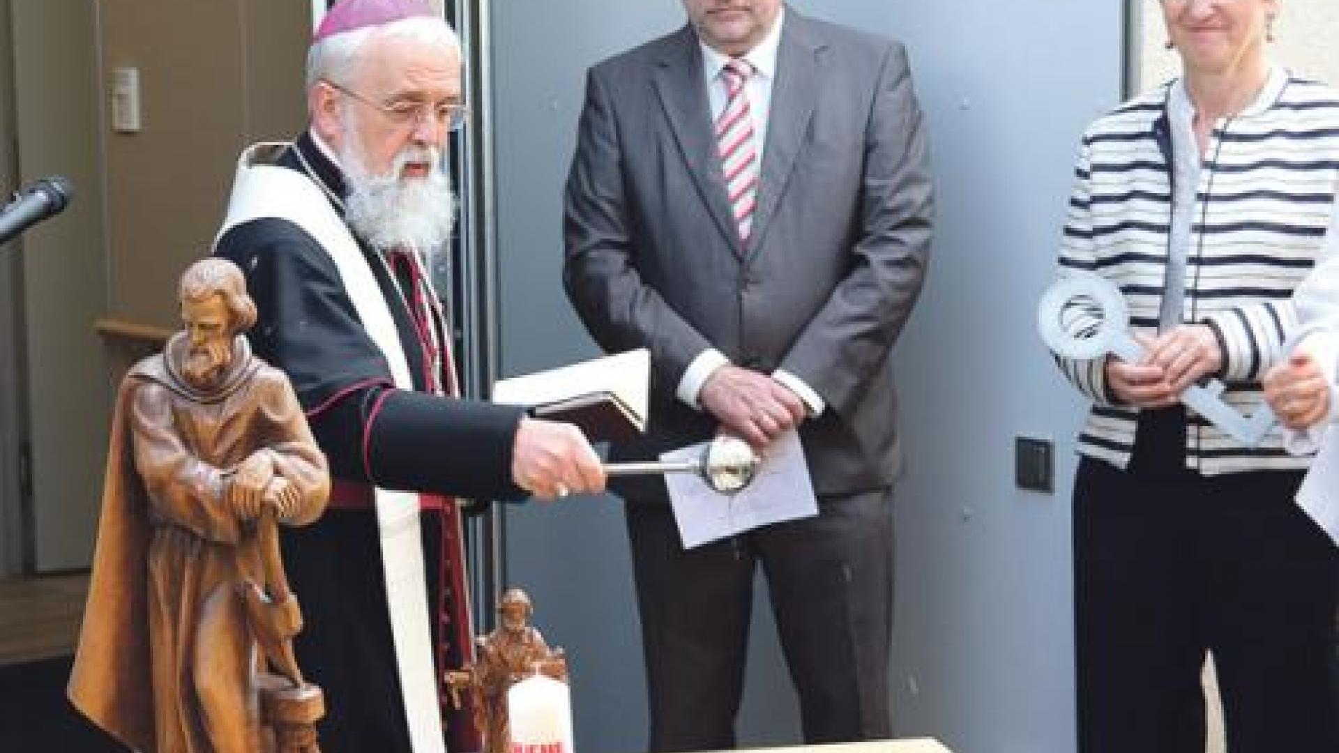 | Bischof Feige weiht das neue Hospiz ein und segnet die Kreuze für die Gästezimmer. | Foto: Karsten Holling |